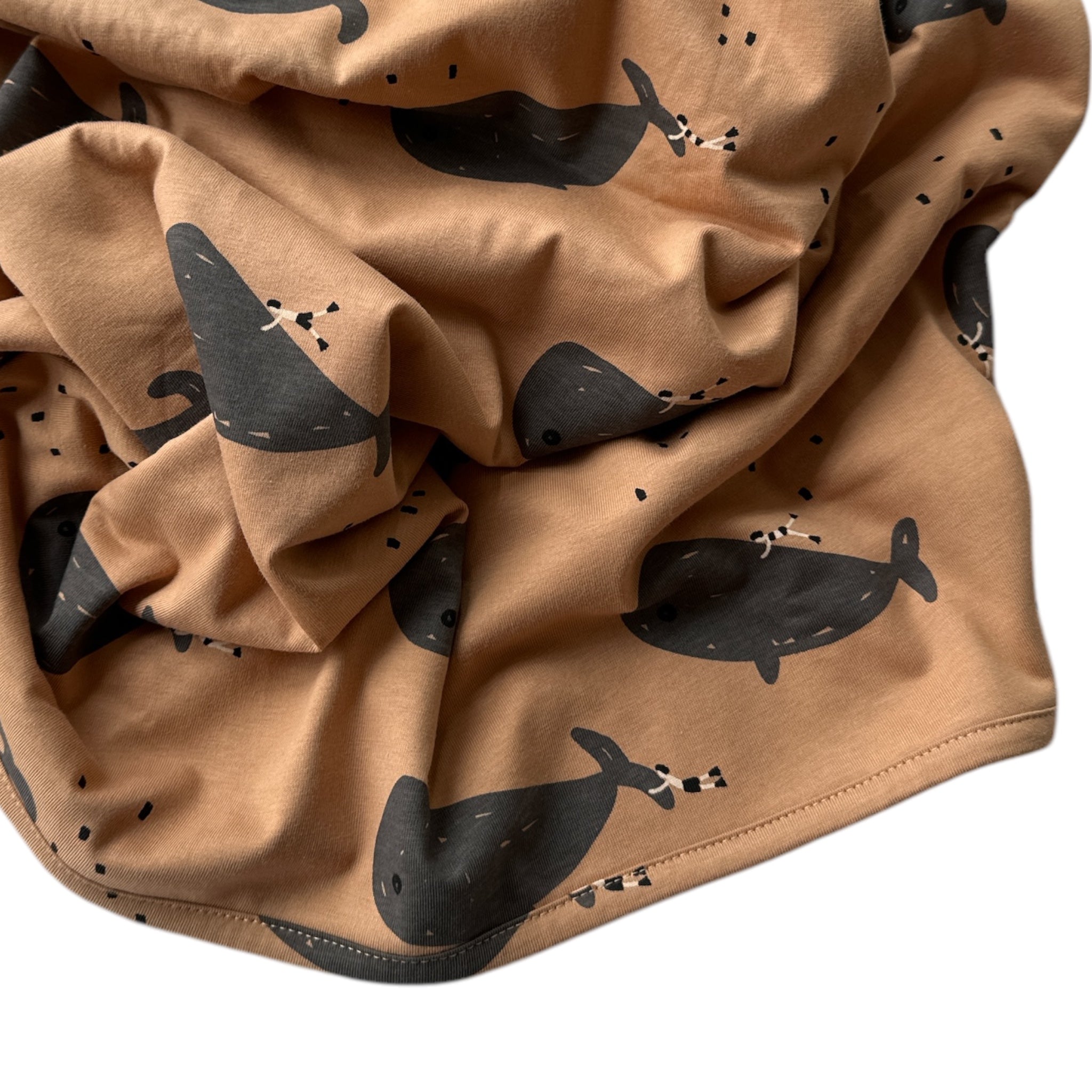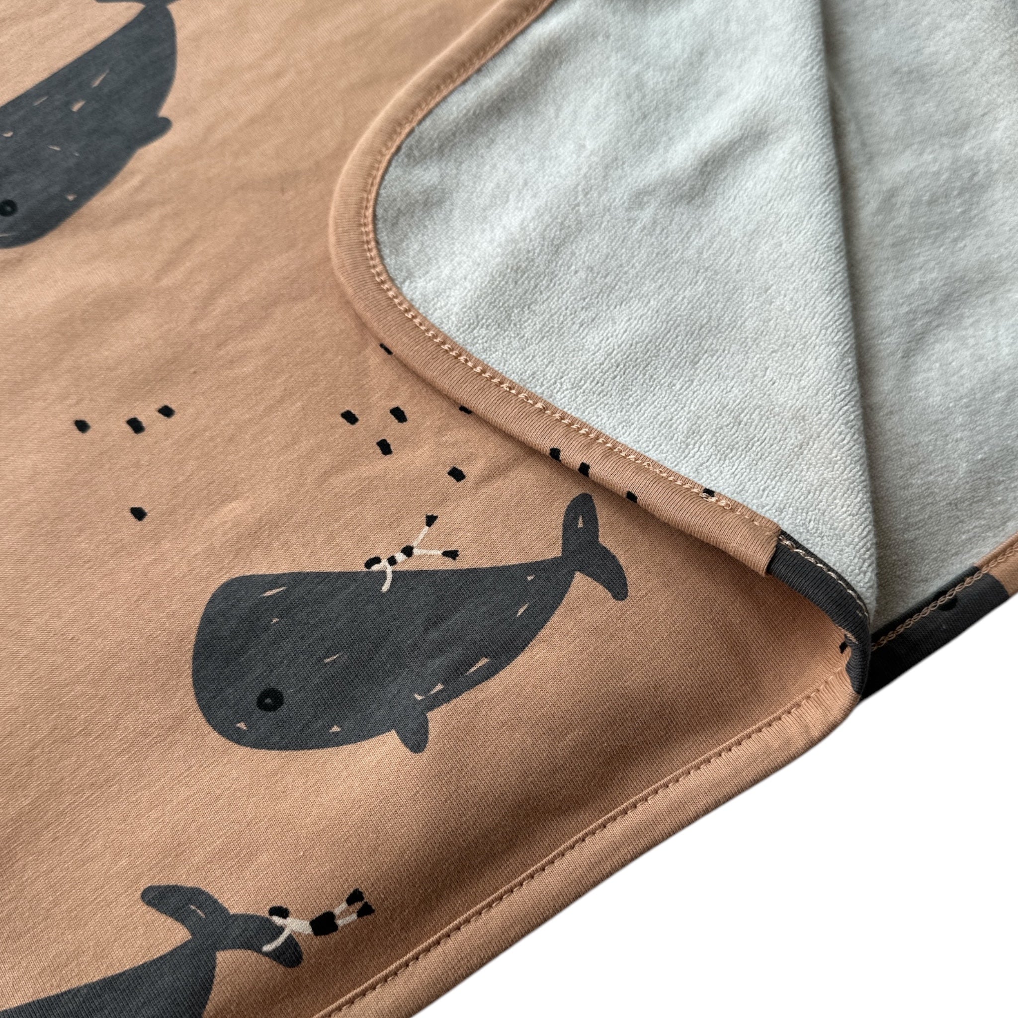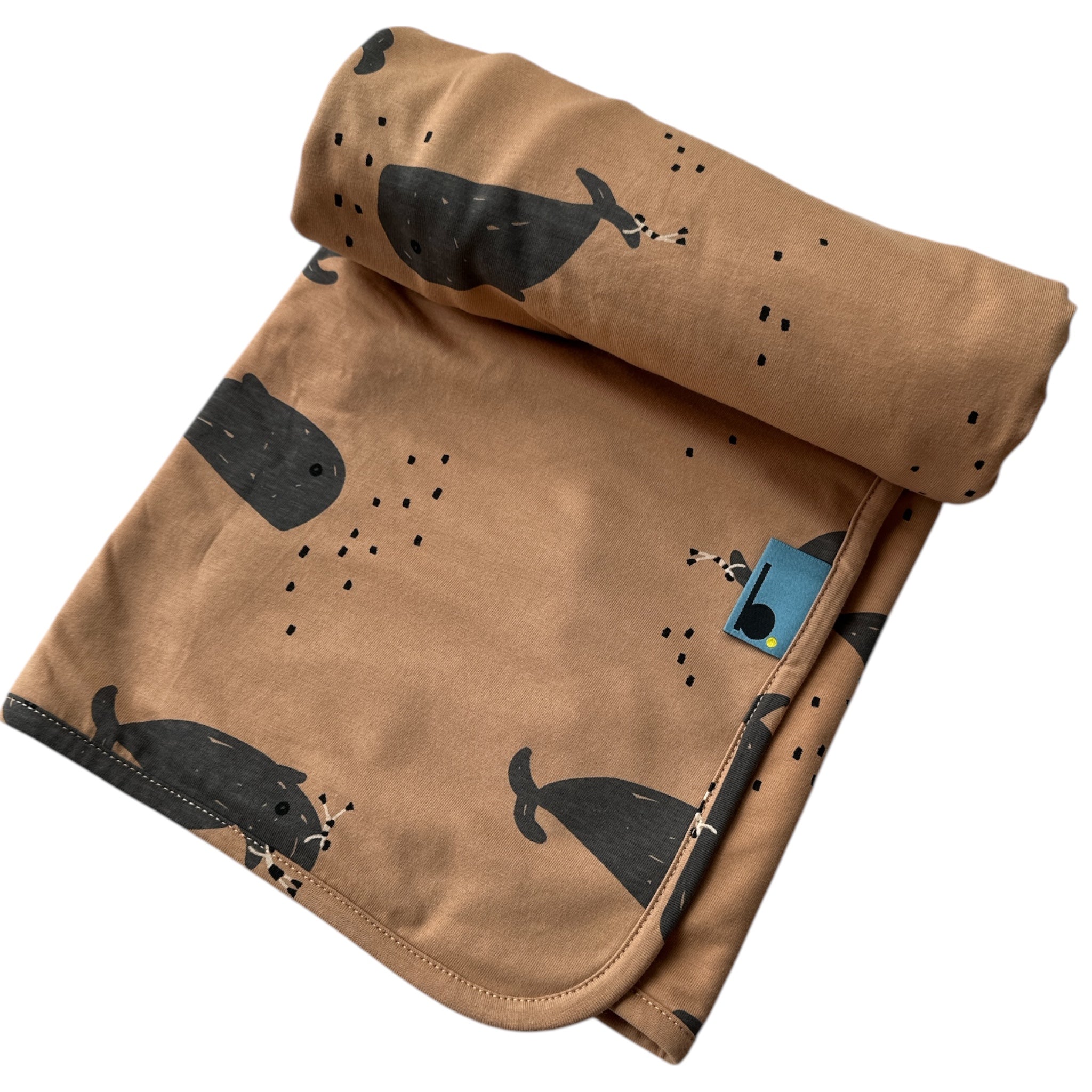 This 100% organic cotton knitted blanket features a brown background with a cute whale and diving pattern print. It's soft, luxurious, and perfect for wrapping your baby in comfort. Made from natural, pure, and eco-friendly materials, it’s lightweight and cozy, offering all-season comfort. Free from chemicals and toxins, this non-toxic blanket is gentle on your baby’s skin and kind to the environment.