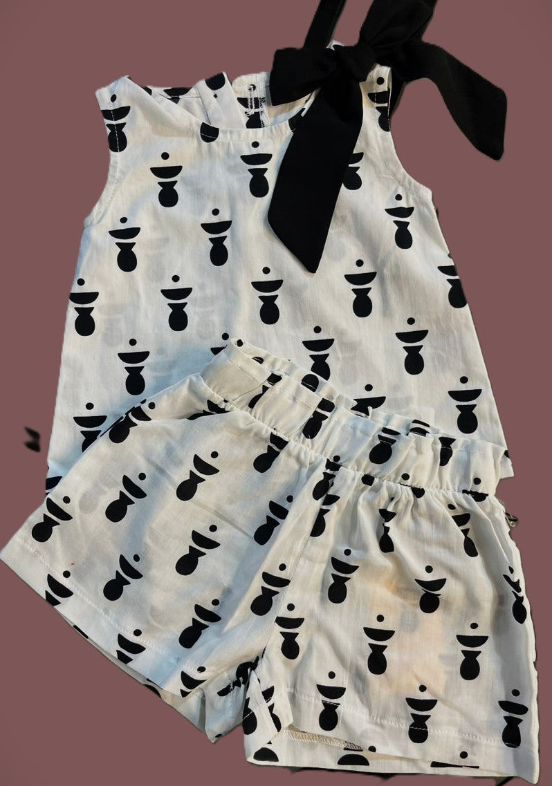 Introducing the Two-Piece Yell-oh Summer Set, a stylish outfit for girls. Crafted from 100% cotton, this set features an abstract black and white print on both the tank top and matching shorts. The tank top is adorned with a charming black bow detail, adding a playful touch to this chic summer look. Ideal for summertime.