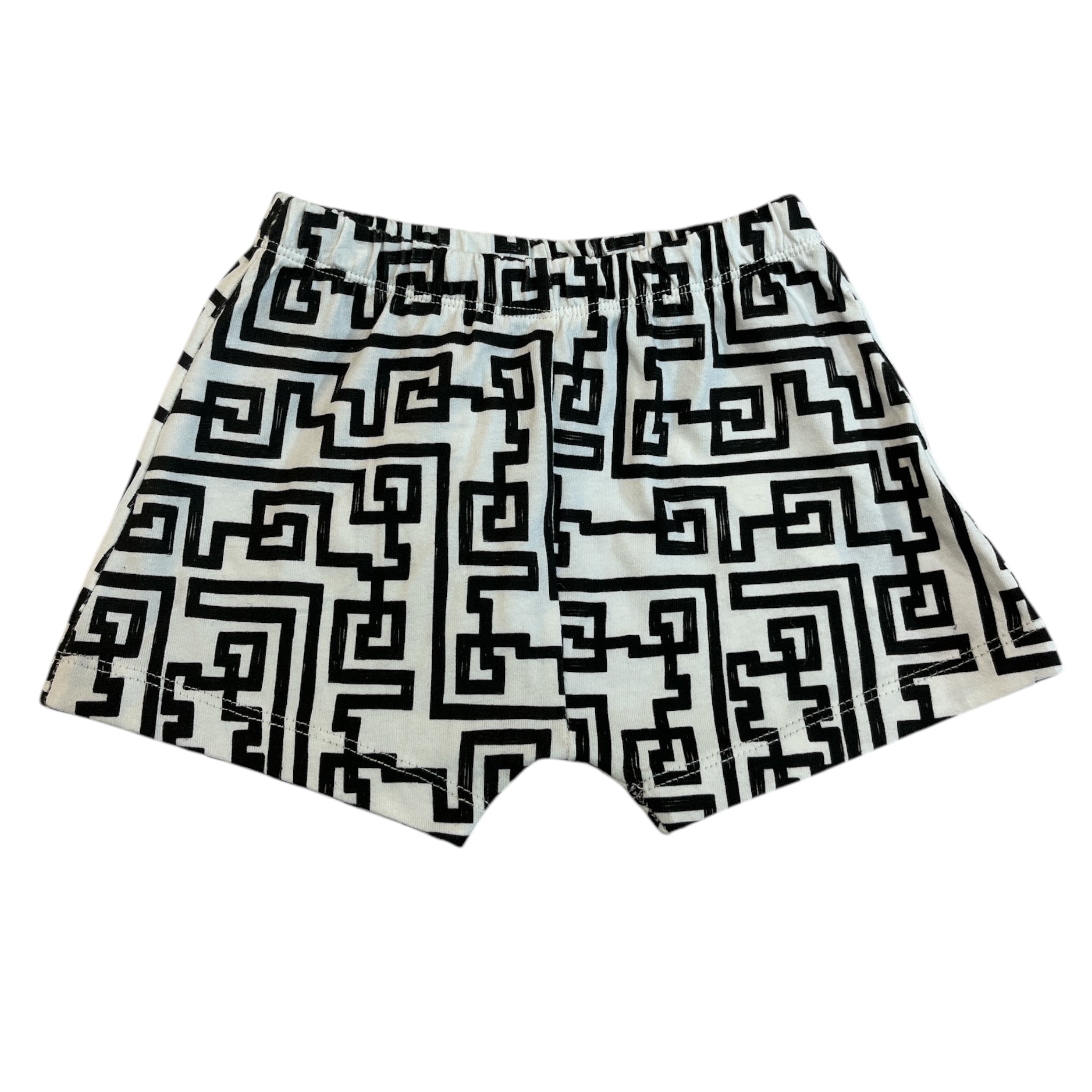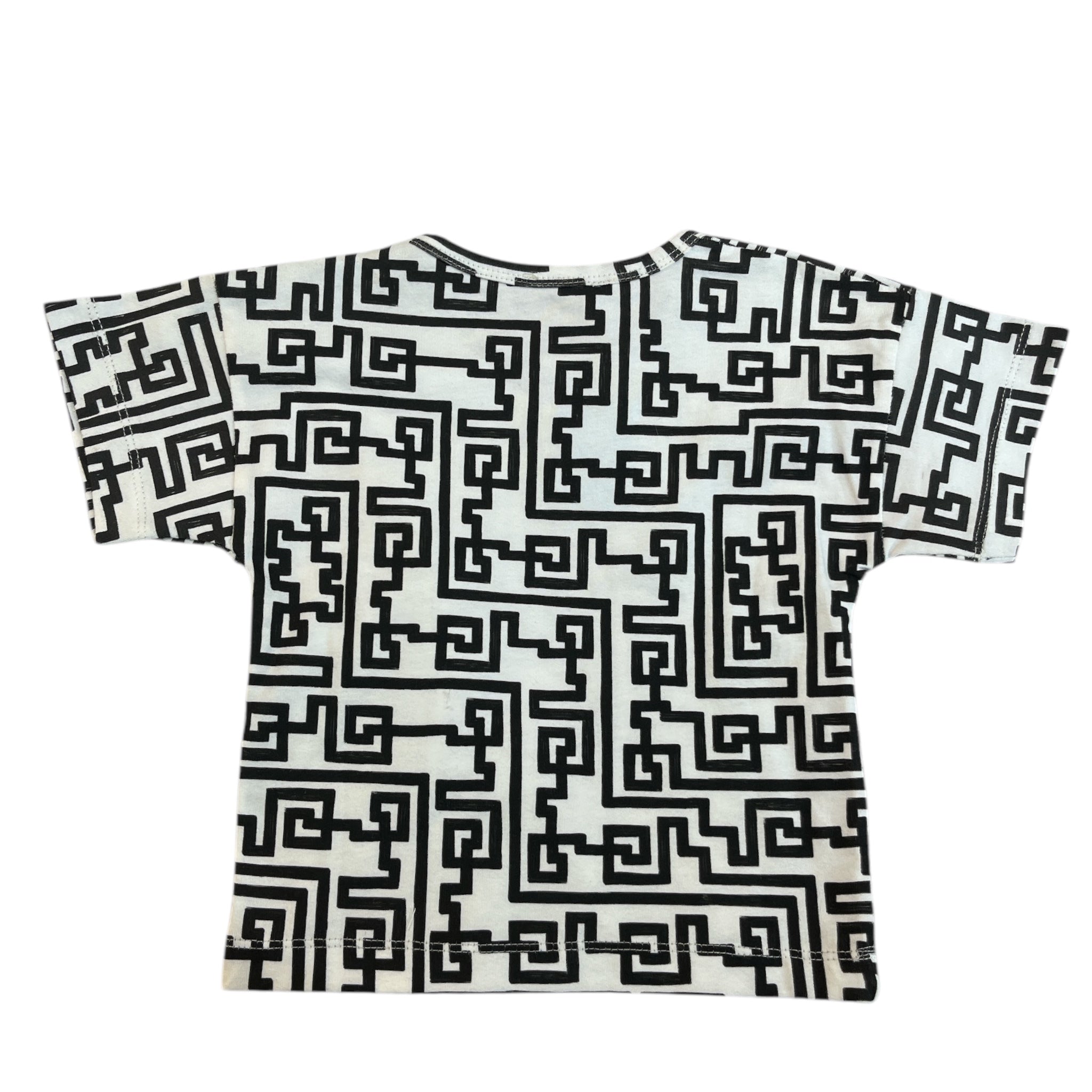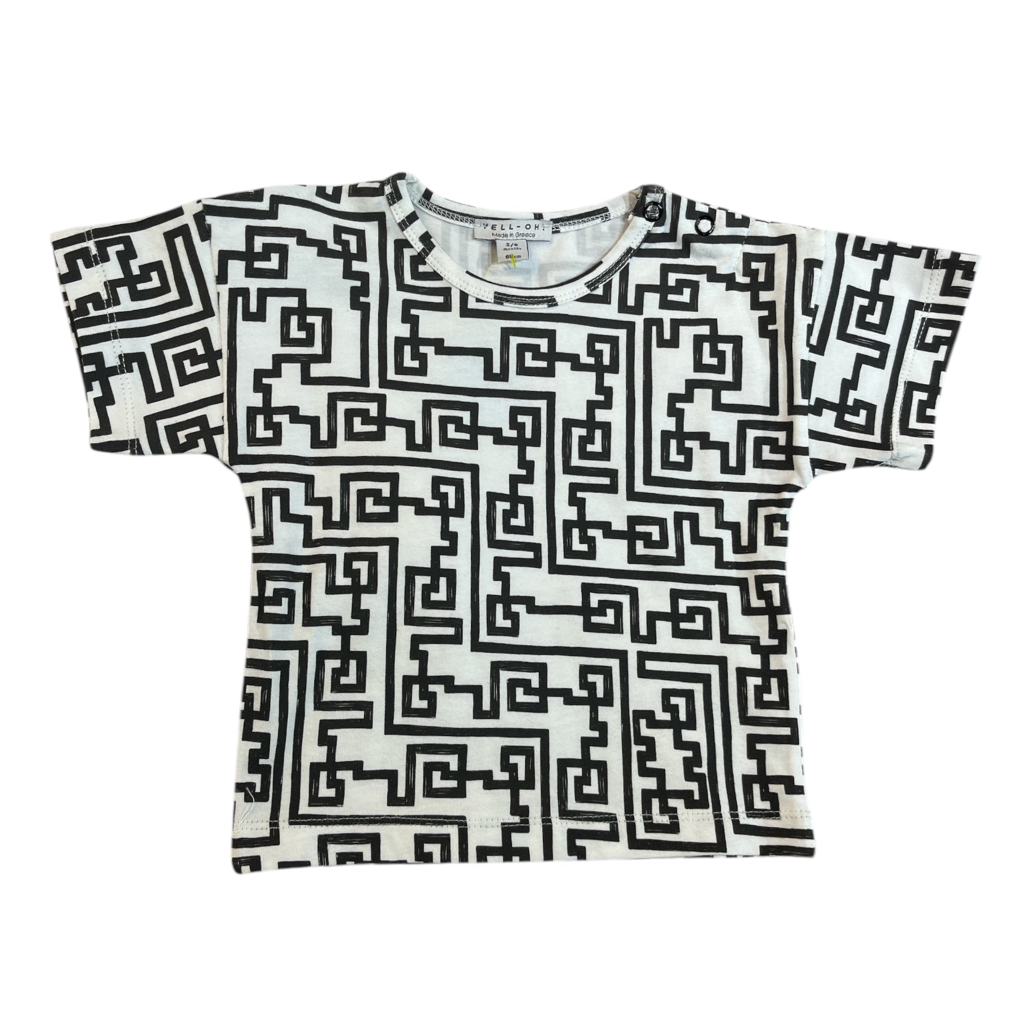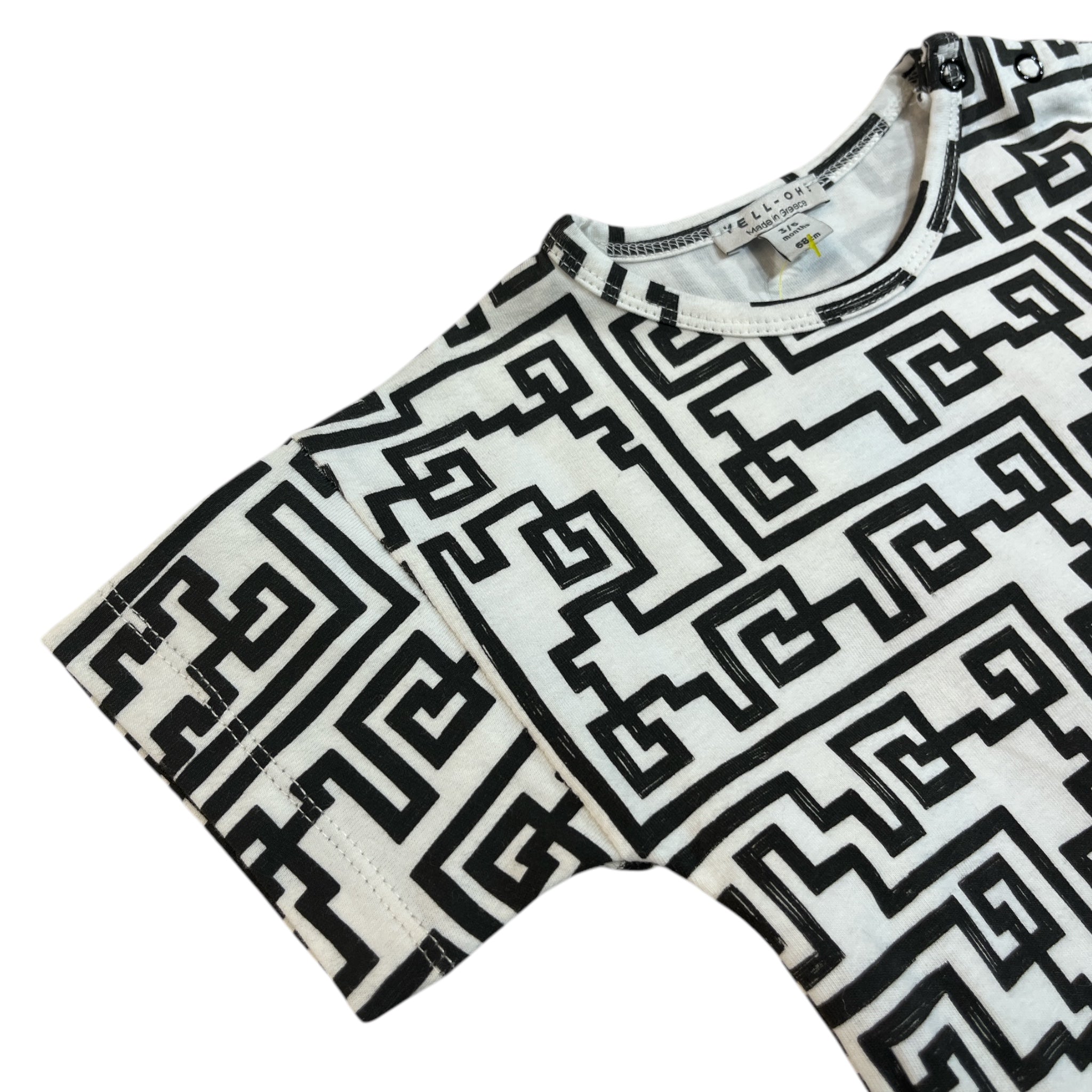 Introducing the Yell-oh Children's Cotton Set, crafted from 100% organic cotton with a chic black and white lined abstract print on both pieces. This eco-friendly set includes a soft t-shirt with a convenient button closure on the shoulder and thin leggings with a comfortable elastic waistband for easy dressing.