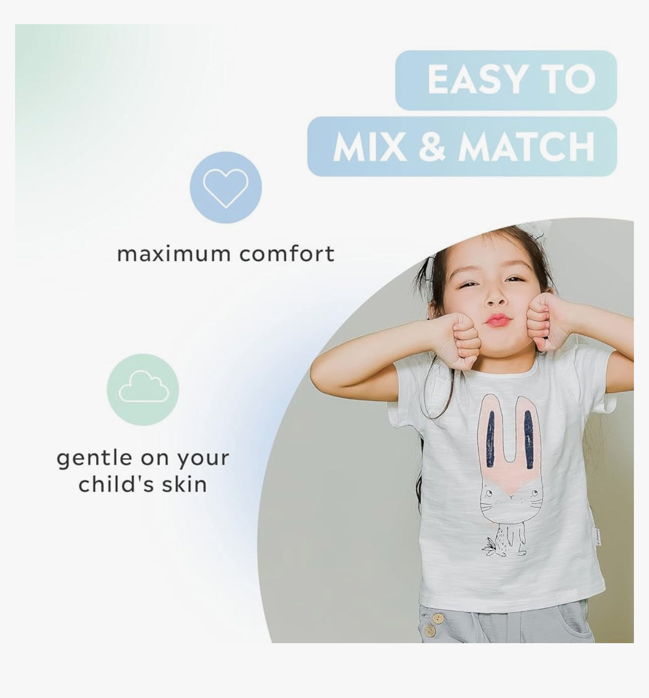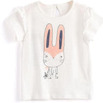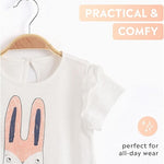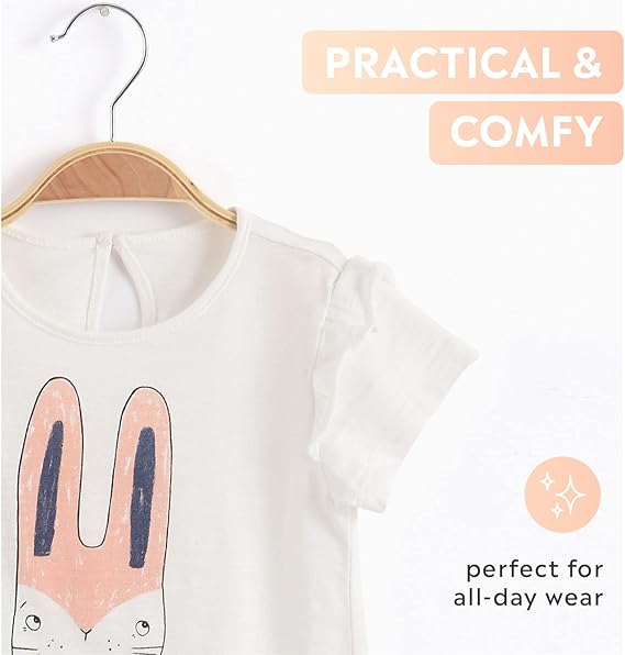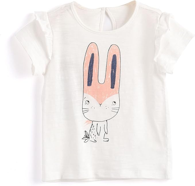 This adorable Aimama 100% cotton white T-shirt features ruffled sleeves and an open back for easy dressing. With a playful pink and black abstract bunny rabbit print, it adds a fun, stylish touch to any outfit. Soft, breathable, and comfortable, this tee is perfect for casual wear and springtime adventures. A must-have addition to your little one’s wardrobe, it’s both cute and practical and machine washable for easy care.