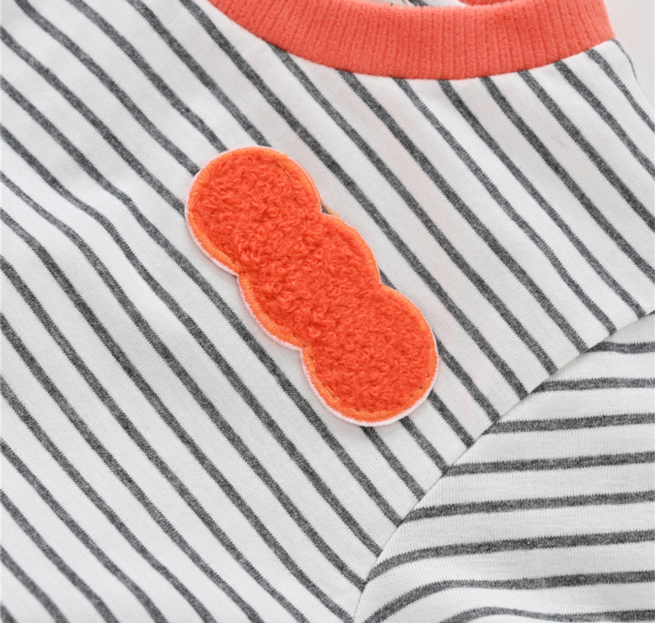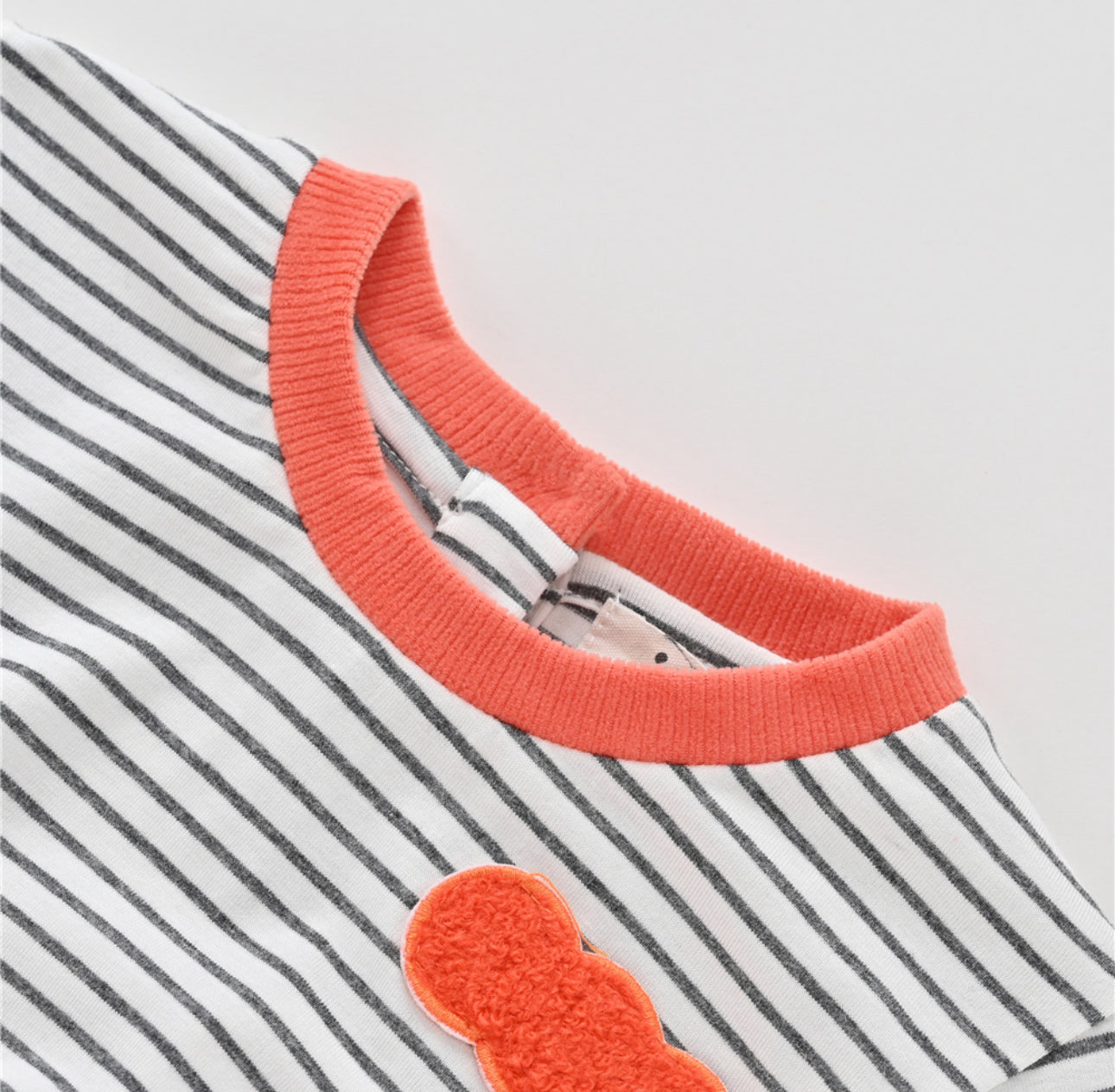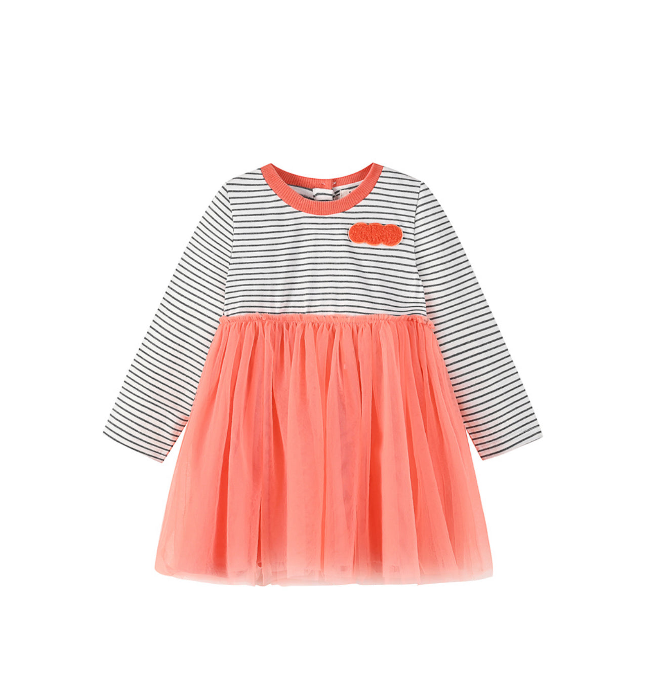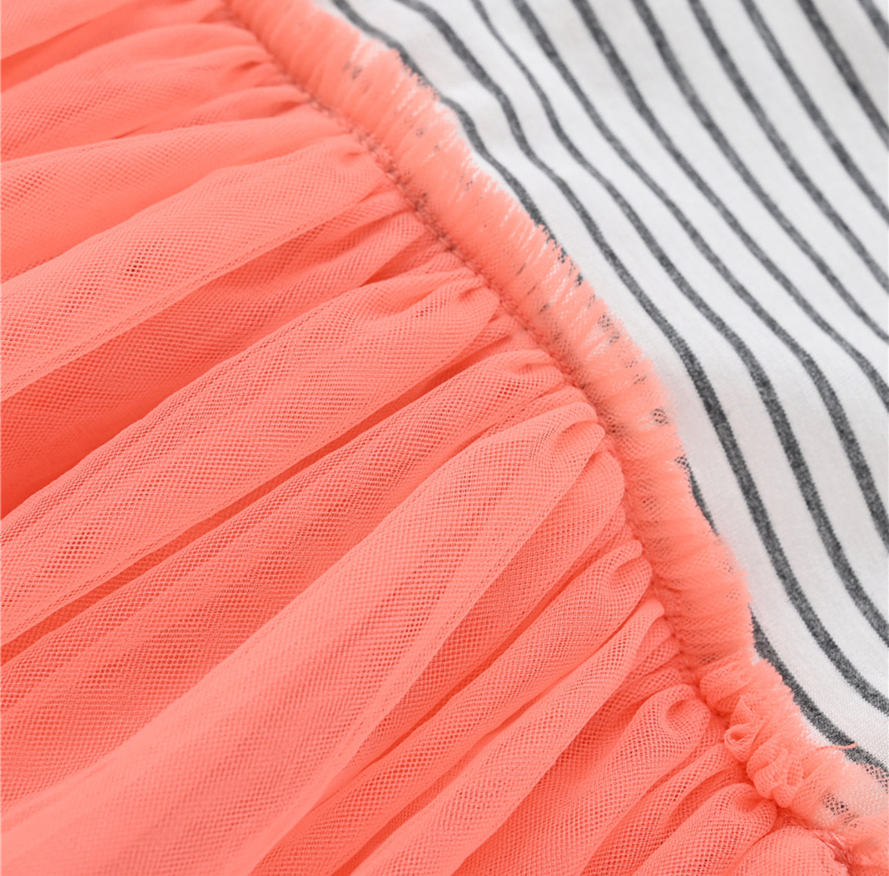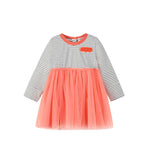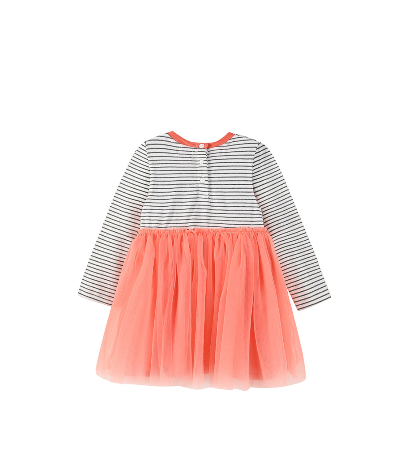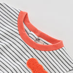The Aimama Striped Ruffle Dress is a playful and stylish piece for little girls aged 18M to 7 years. Crafted from soft, breathable fabric, this dress features classic black and white stripes for a timeless look. A peachy pink ruffle bottom adds a fun, feminine touch, while the matching hemmed neckline provides a cohesive, polished finish. The fuzzy peachy embroidered detail on the front brings extra charm and texture. Designed for both comfort and style, this dress is perfect for twirling through everyday adventures or dressing up for special occasions.
