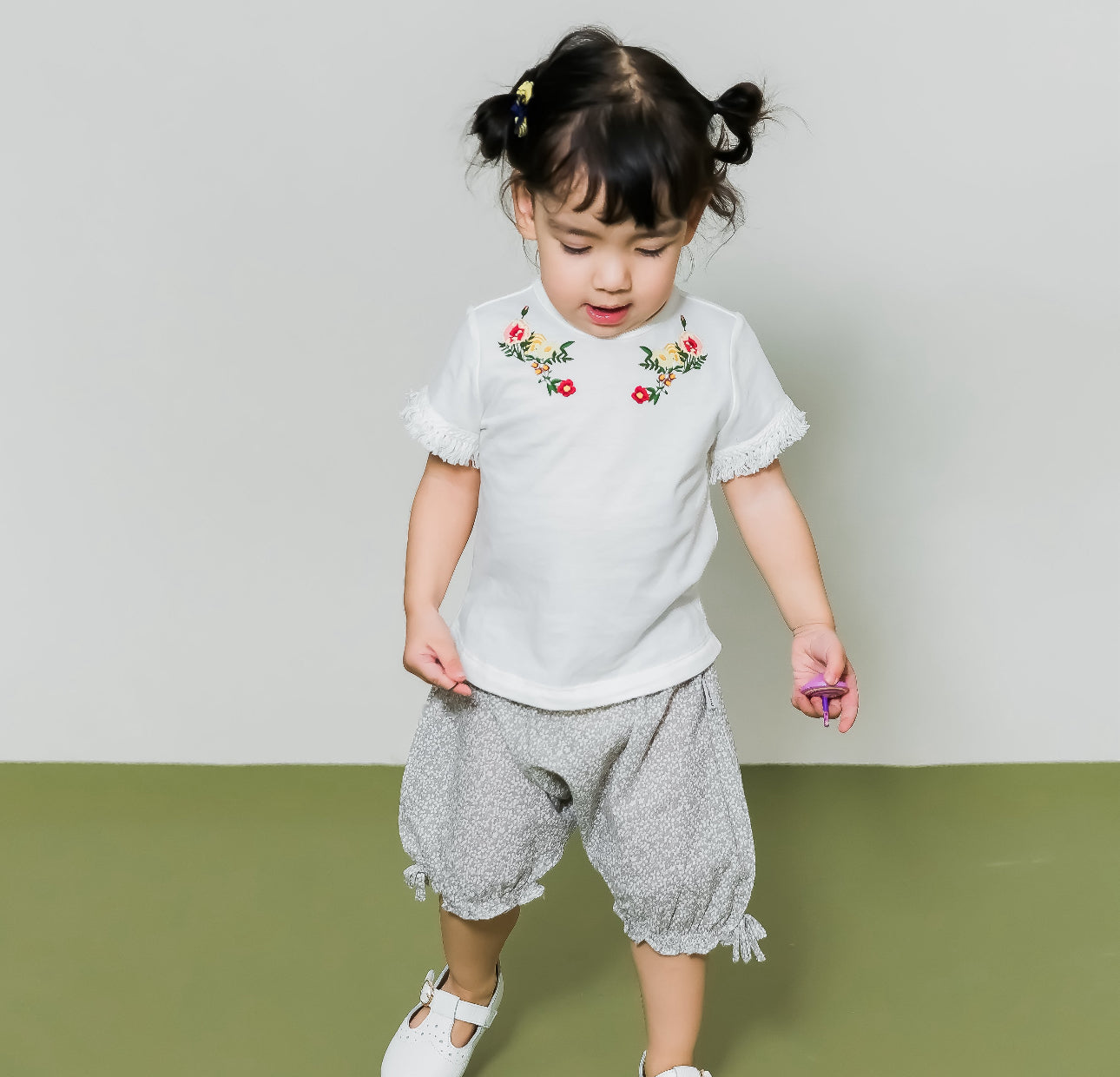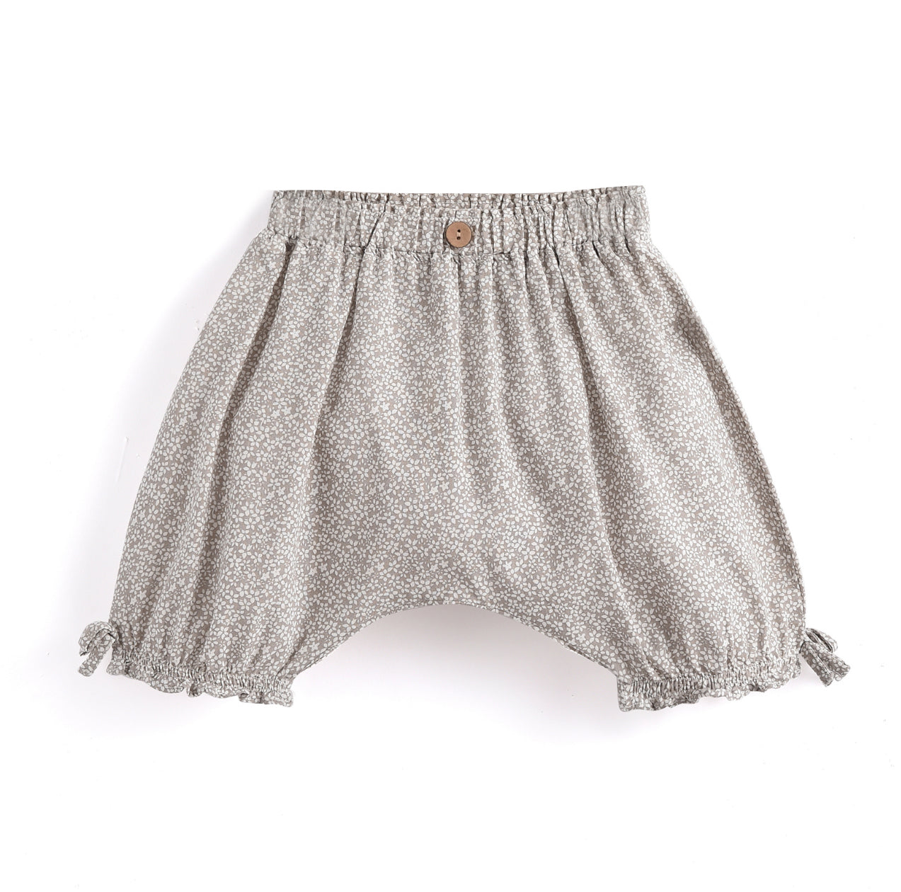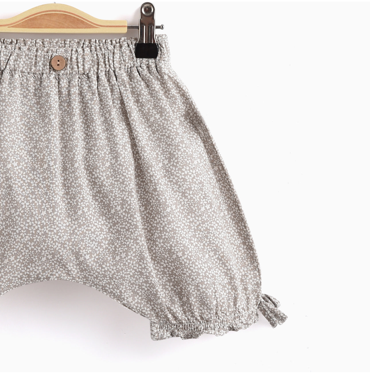 The Aimama Grey Floral Print Shorts are a comfortable and stylish choice for little ones aged 12 months to 6 years. Made from 100% cotton, these flowy shorts feature a delicate floral print for a soft, feminine touch. The wide-leg design offers plenty of movement, while the brown button details add a charming, rustic flair. The cinched waist ensures a secure and comfortable fit, and the tied, cinched leg cuffs complete the look with a playful, trendy finish. Perfect for everyday wear or dressed-up occasions, these shorts are as comfortable as they are stylish.
