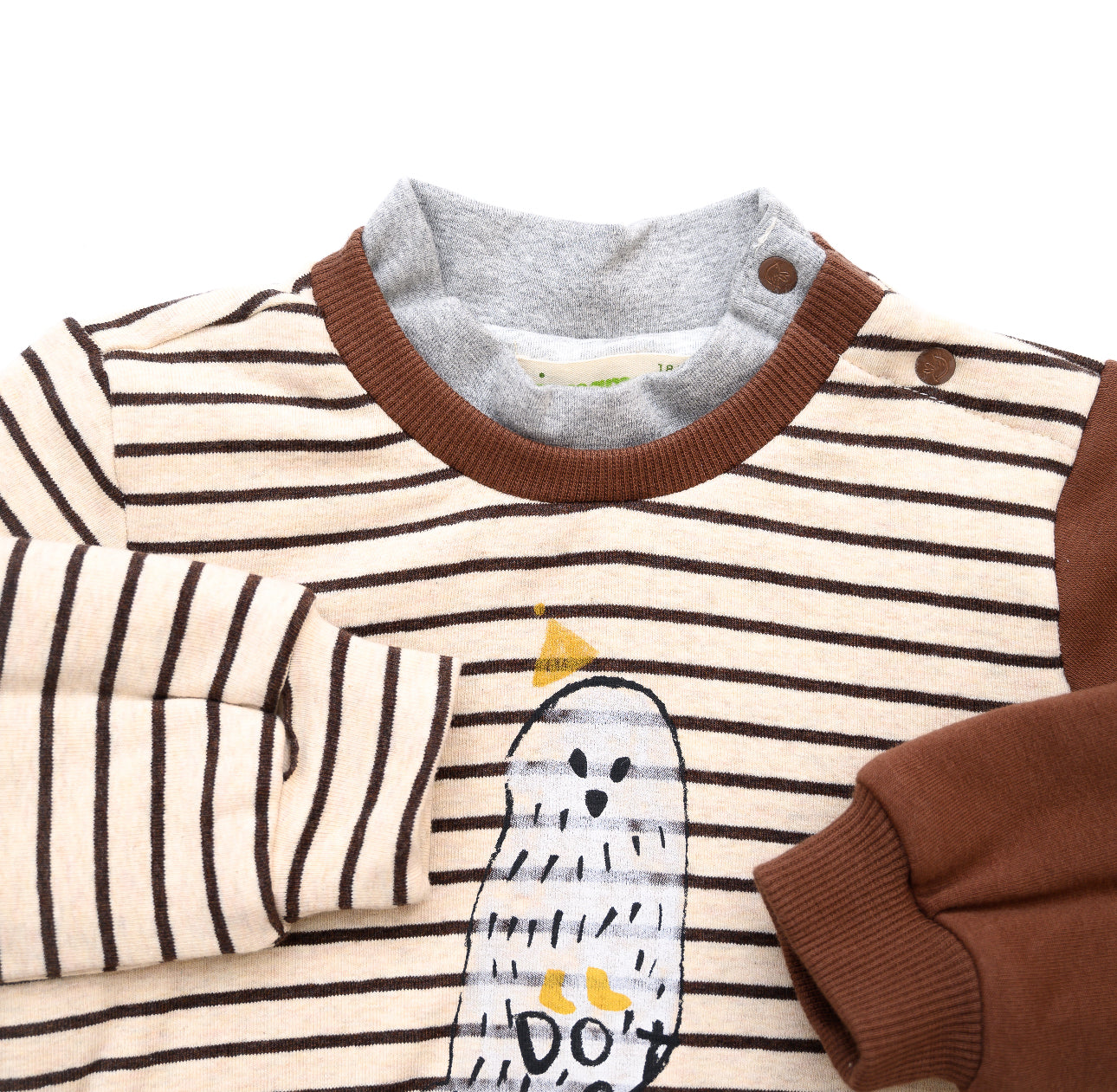 The Aimama Cream & Brown Striped Snow Owl Crewneck is a cozy and stylish essential for little ones aged 12 months to 6 years. Made from soft, breathable cotton, this unisex crewneck features a unique layered design with classic cream and brown stripes and a contrasting brown color-block sleeve for a modern touch. The front is adorned with a charming snow owl detail, adding a playful yet sophisticated element. Perfect for layering in cooler weather, this crewneck blends warmth, comfort, and effortless style for everyday adventures.