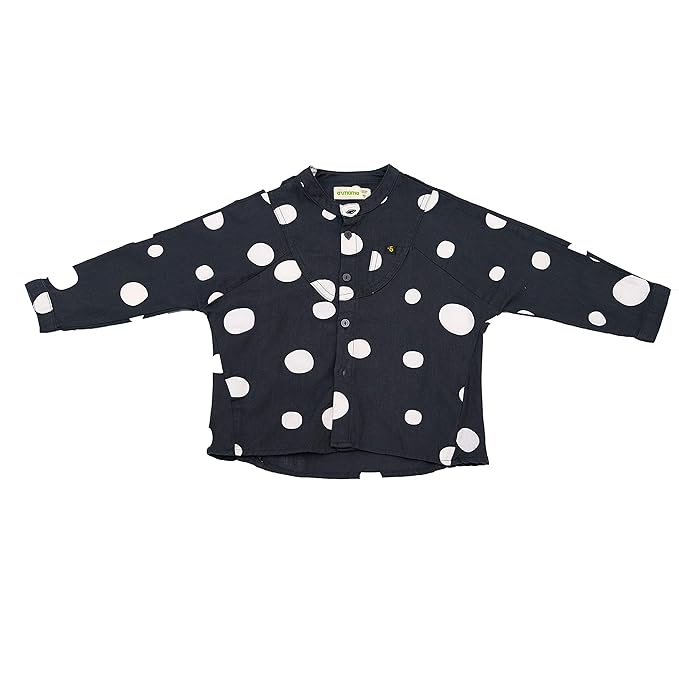 The Aimama Polka Dot Button-Down Shirt for boys is a trendy and charming addition to any little one's wardrobe. Made from 100% cotton, this long-sleeve shirt offers both comfort and breathability. The black base with white polka dot print adds a playful, stylish touch, while the Mandarin collar and woven design give it a vintage, button-down appeal. Perfect for a variety of occasions, from casual outings and school uniforms to holiday parties and photoshoots, this shirt is a versatile choice for your baby boy. Nicely stitched and thoughtfully detailed, it’s available in sizes 12 months to 6 years.