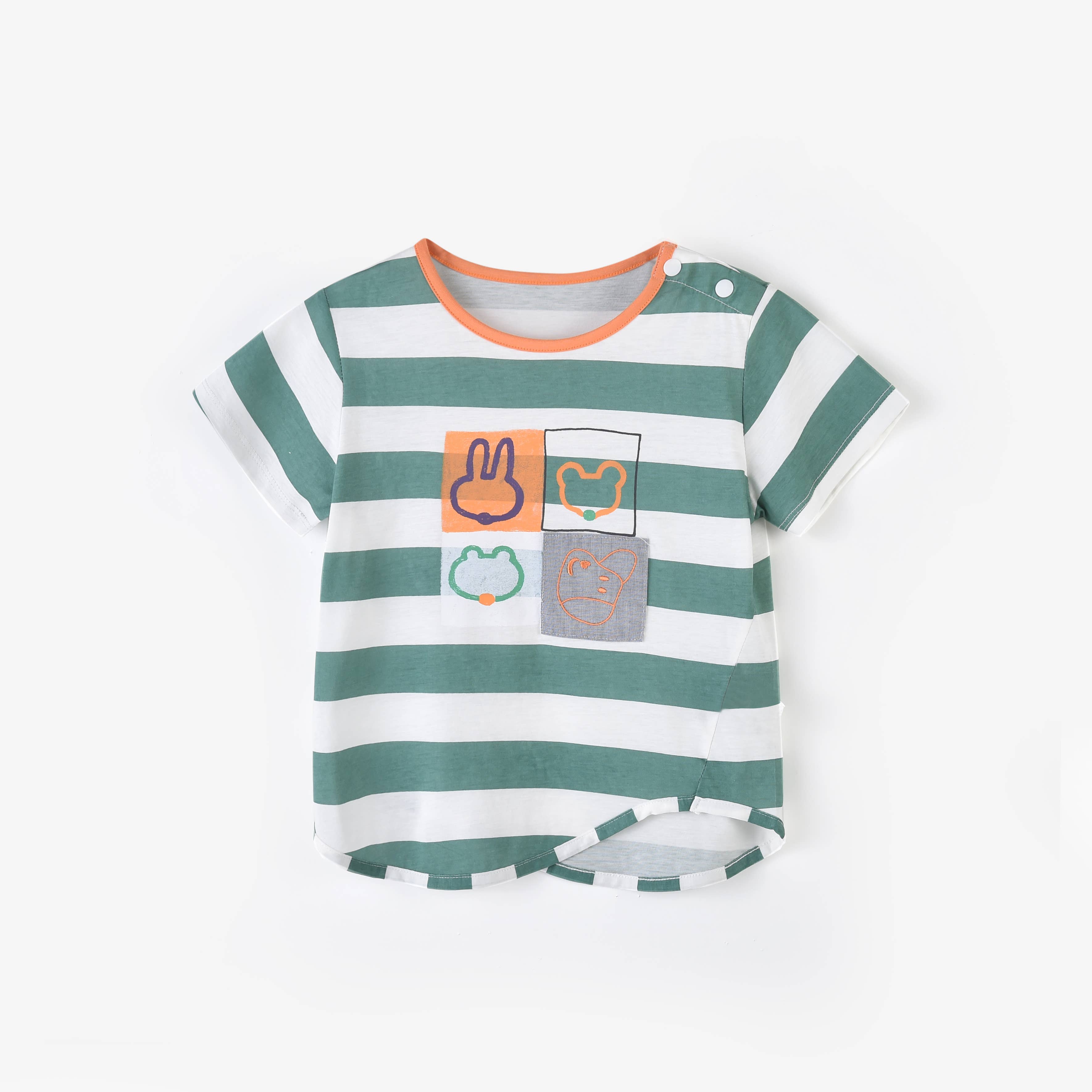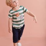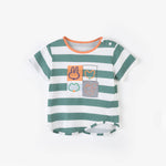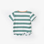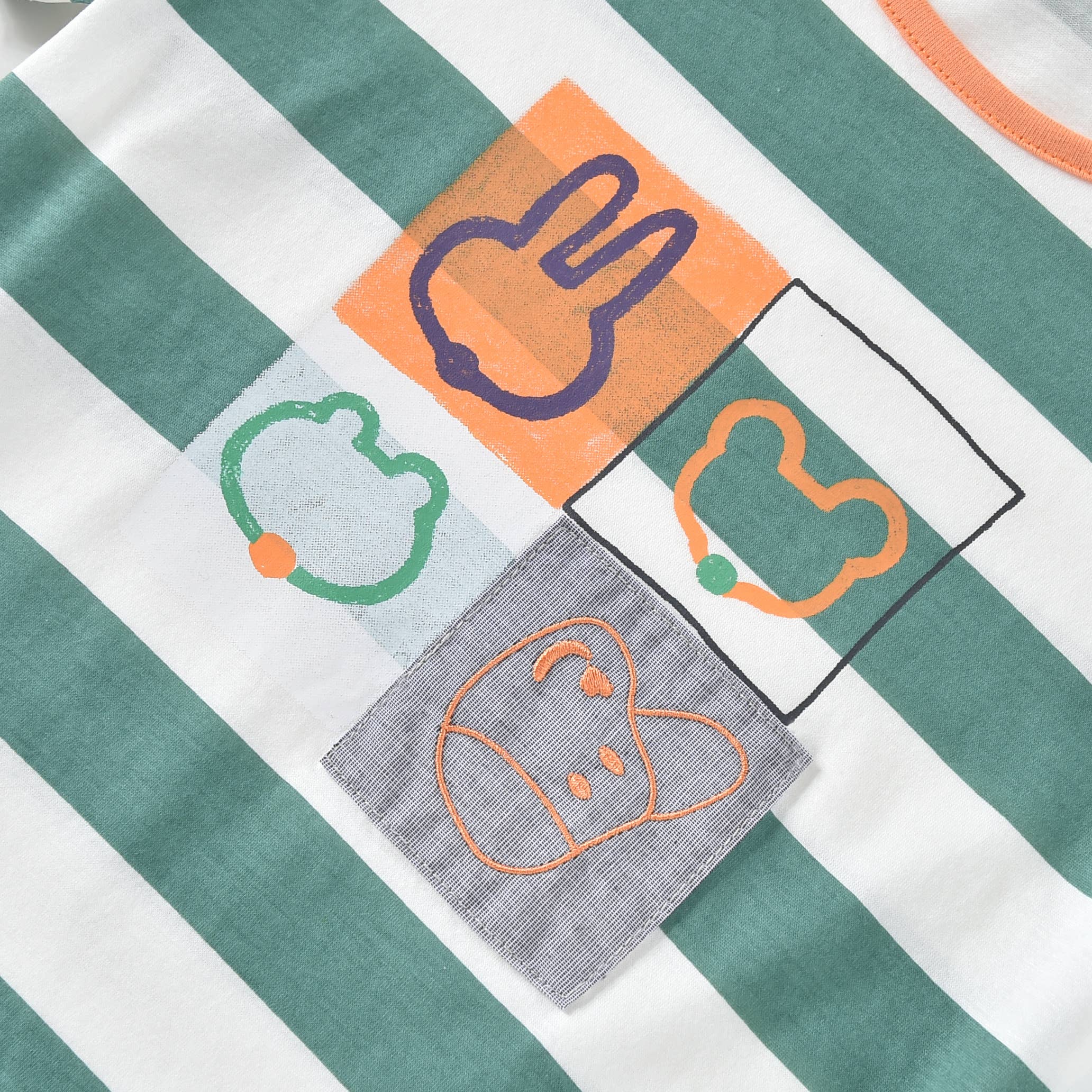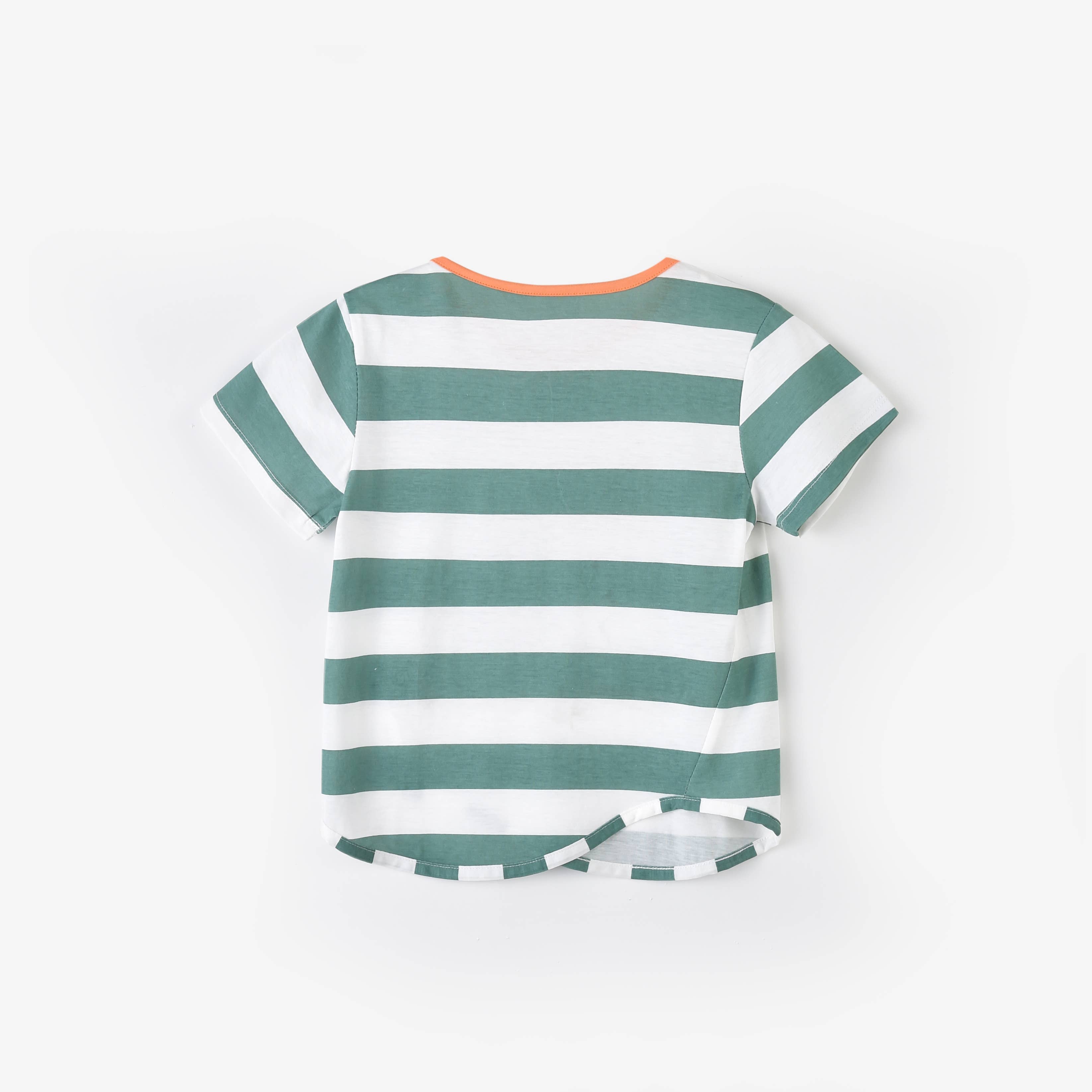 The Aimama Abstract Animal Patch T-Shirt is a fun and textured piece for little ones aged 12 months to 6 years. Made from 100% cotton, this soft and breathable t-shirt ensures comfort for all-day play. Designed with a classic round neckline in a bold orange contrast, it features thick green and white vertical stripes for a striking look. The front showcases a unique mix of abstract animal prints and patchwork details, adding playful texture and dimension. With short sleeves and a relaxed fit, this tee is perfect for casual outings, bringing a creative and adventurous touch to any outfit.