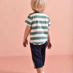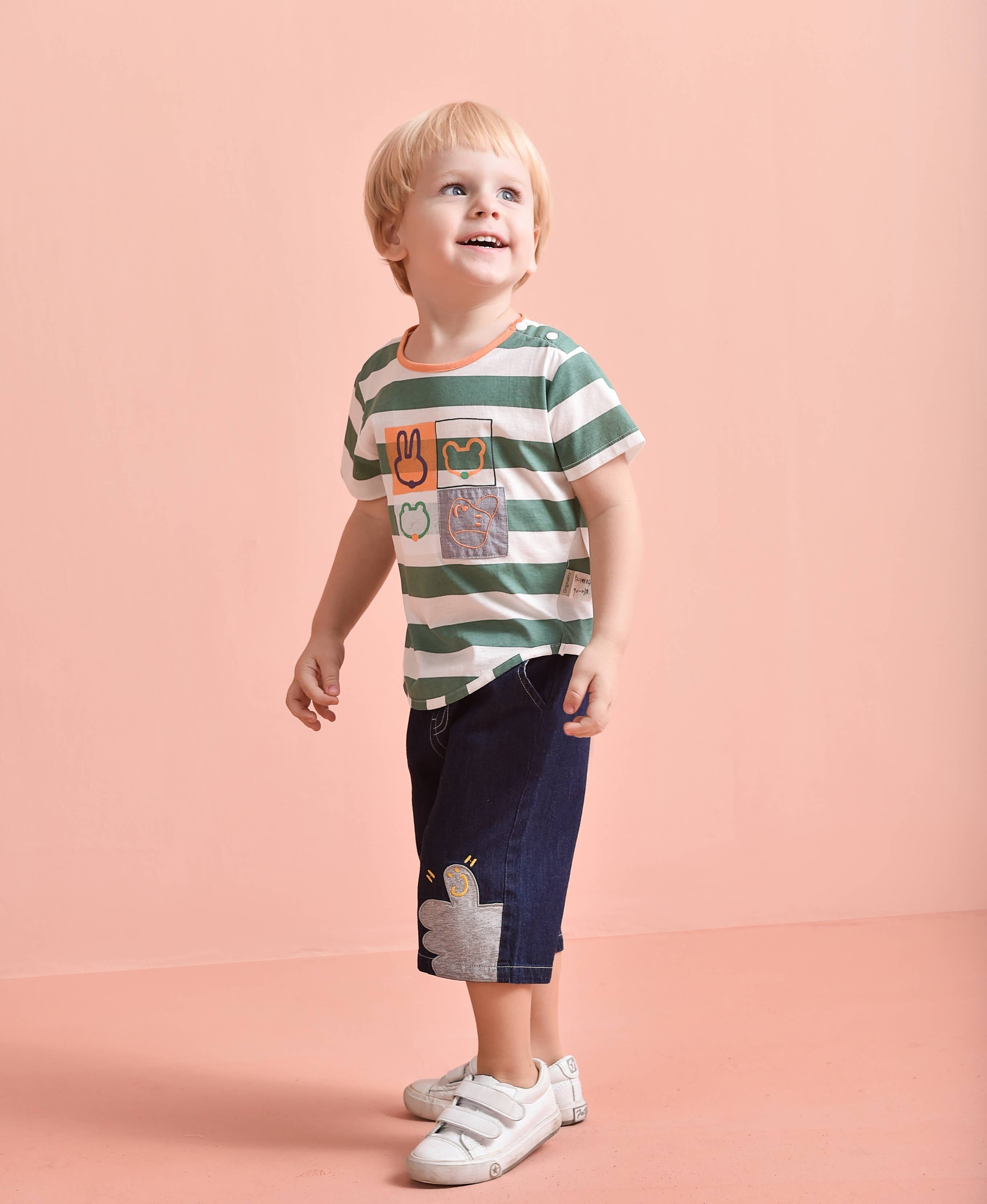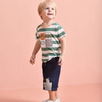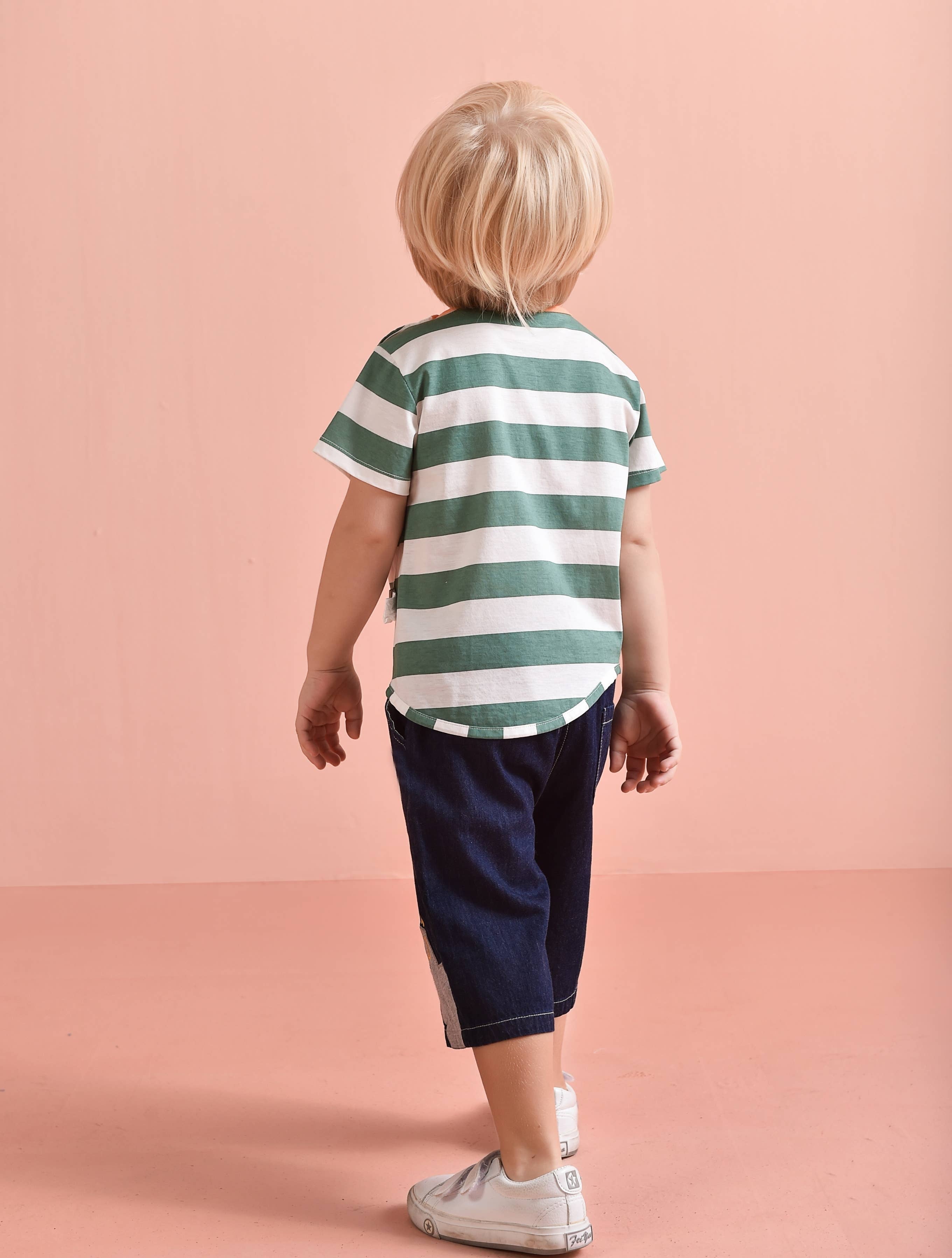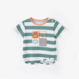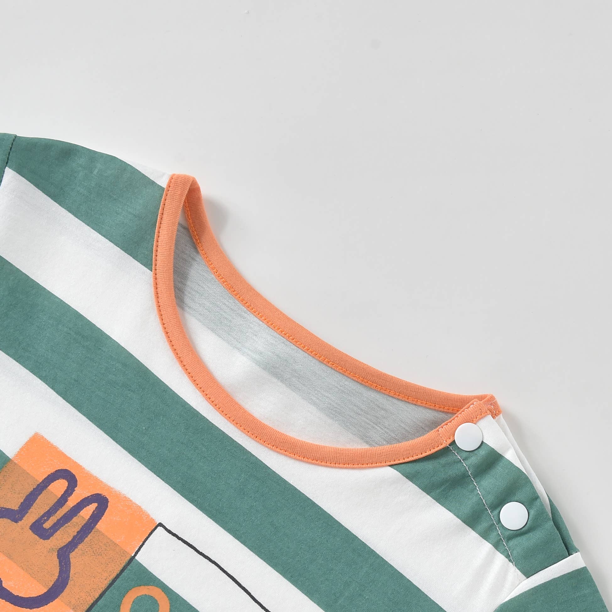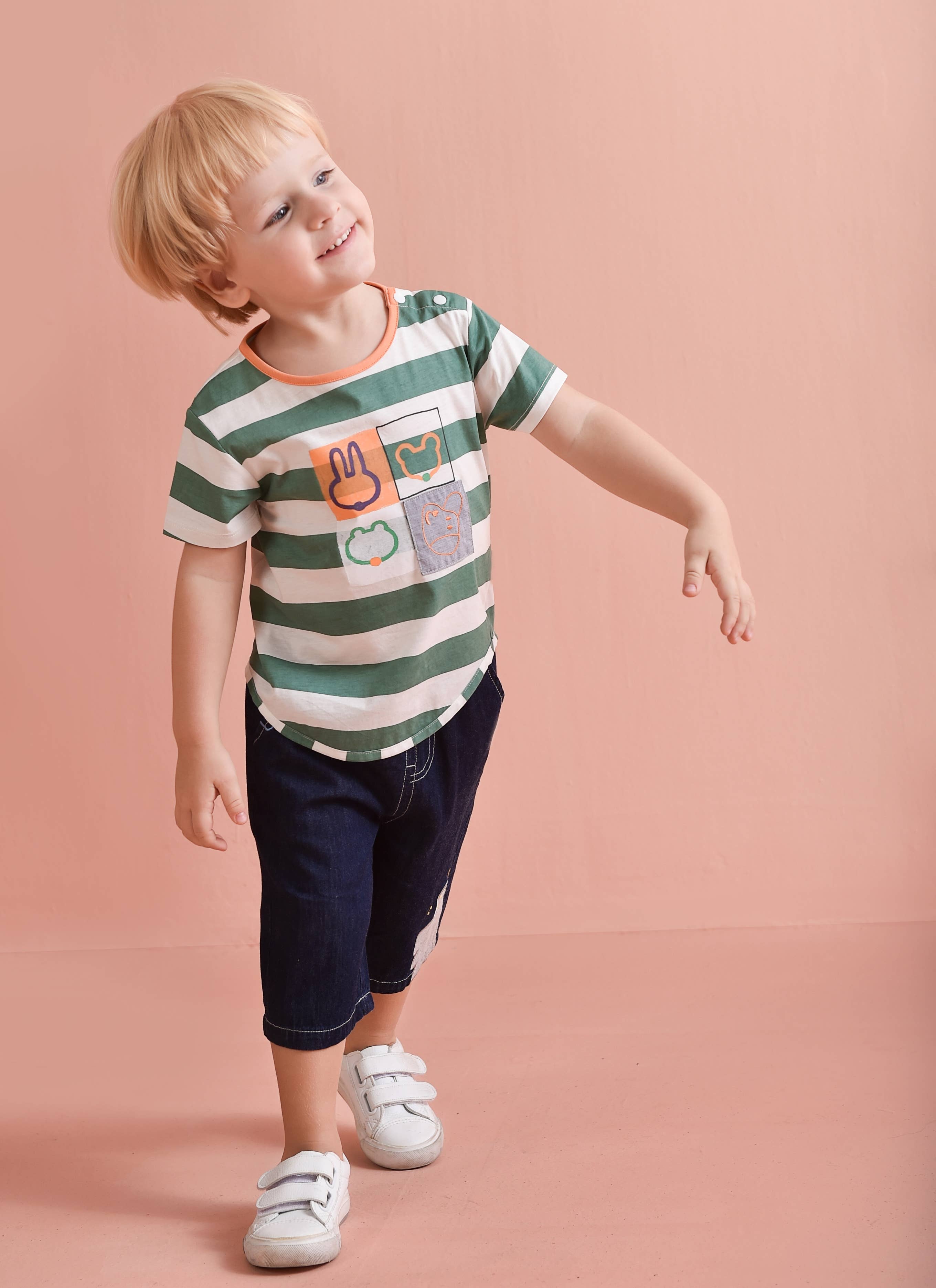 The Aimama Abstract Animal Patch T-Shirt is a fun and textured piece for little ones aged 12 months to 6 years. Made from 100% cotton, this soft and breathable t-shirt ensures comfort for all-day play. Designed with a classic round neckline in a bold orange contrast, it features thick green and white vertical stripes for a striking look. The front showcases a unique mix of abstract animal prints and patchwork details, adding playful texture and dimension. With short sleeves and a relaxed fit, this tee is perfect for casual outings, bringing a creative and adventurous touch to any outfit.