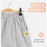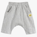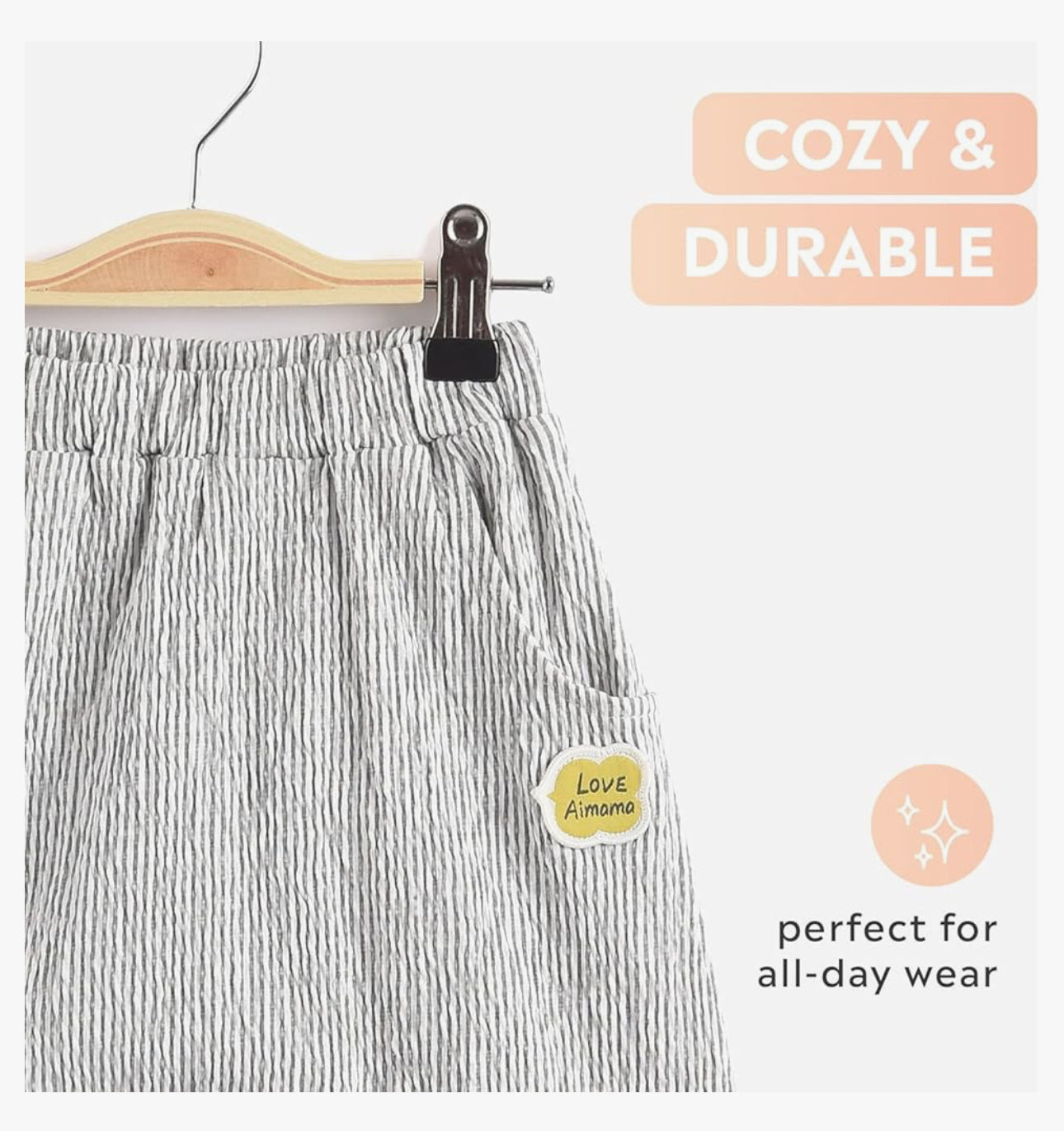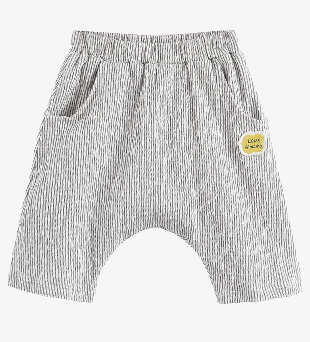 The Aimama Striped Cotton Harem Shorts are a stylish and comfortable choice for little boys aged 2 to 6 years. Made from breathable 100% cotton, these lightweight shorts feature a relaxed harem-style fit for ultimate ease of movement. The subtle grey and white striped pattern adds a timeless, versatile touch, while the elastic waistband ensures a snug yet flexible fit. Functional side pockets provide added convenience, and the charming "Love Aimama" patch detail adds a playful finishing touch.