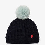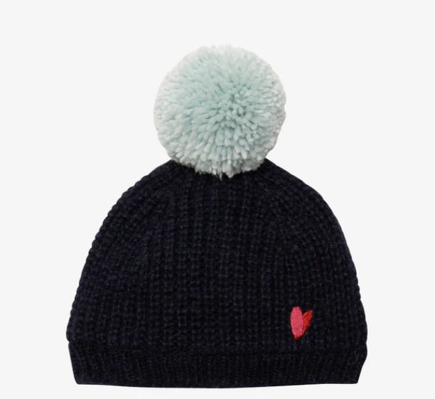 This baby girl's navy blue beanie is the perfect accessory to keep your little one warm and stylish. Made from soft, stretchy fabric, it provides a snug and comfortable fit that gently hugs the head without being too tight. The classic navy blue color is versatile and pairs well with any outfit, and the light blue pom-pom and embroidered heart add some fun. The simple yet cute design is both practical and adorable, ensuring your baby stays cozy while looking fashionable. Whether you're out for a walk or at home, this beanie is a must-have addition to your baby girl's wardrobe, offering warmth and style in one cute package. 6-9months.