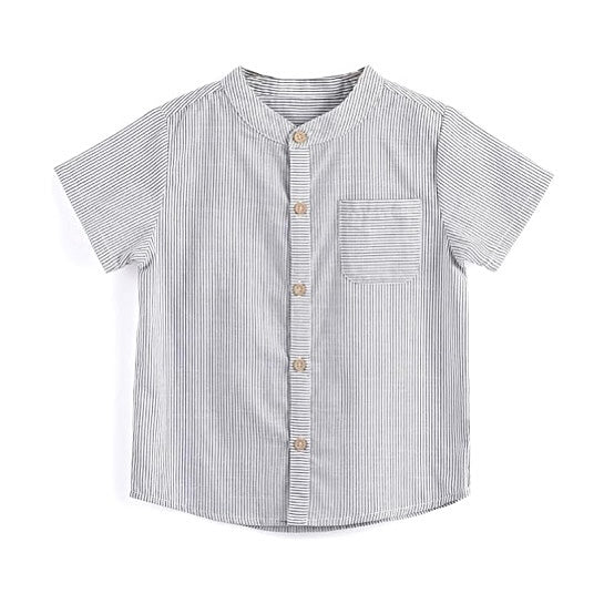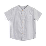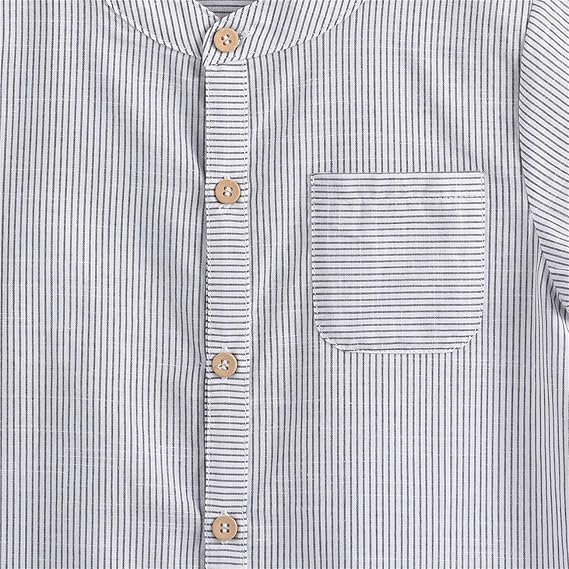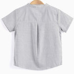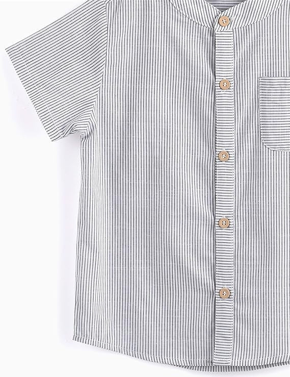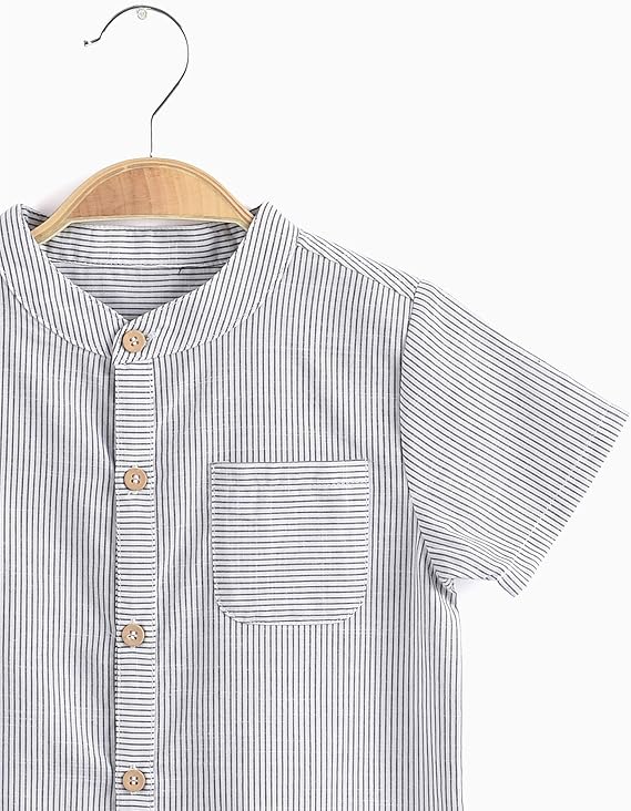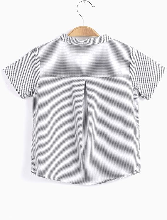 Crafted from 100% soft, breathable cotton, this stylish mandarin neckline striped gray and white tee-shirt is designed for comfort and versatility. Featuring an all-over print and a convenient button closure, this shirt is easy to put on and pairs effortlessly with jeans or pants for a bright, casual look. Ideal for daily wear, school, parties, or festive holidays, it’s a wardrobe staple for both indoor and outdoor occasions! 12 months to 6 years old.