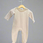 Elegant ivory babygrow for baby girls and boys made from a soft and flexible ribbed cotton fabric. Features a shiny pink knitted ribbon detailing on the sides and sleeves, as well as a stitched pink leather logo on the chest.