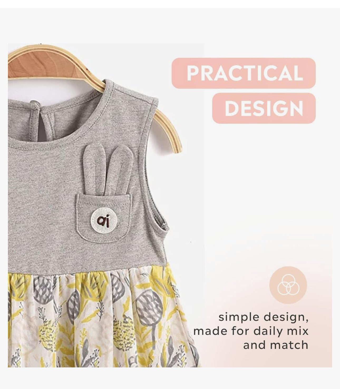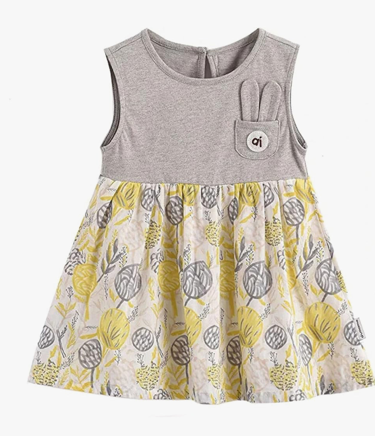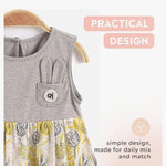 The Aimama Bunny Pocket Nature Dress is a charming and playful outfit for little ones aged 12 months to 6 years. Made from 100% cotton, this dress is soft, breathable, and perfect for all-day comfort. The light grey sleeveless top features an adorable bunny ear pocket detail, adding a whimsical touch, while the flowy skirt showcases a beautiful yellow and grey nature-themed print. Designed with a classic round neckline, this dress is both stylish and functional, making it ideal for everyday adventures, special outings, or playtime fun. A must-have for any little wardrobe!