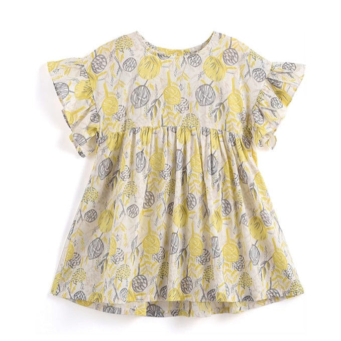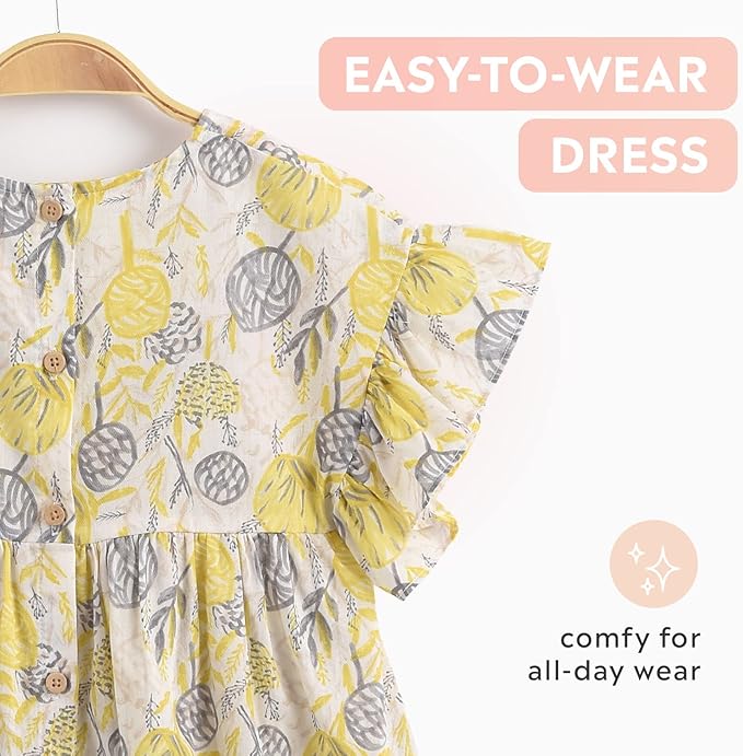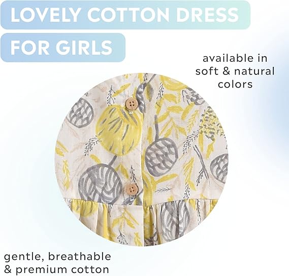 The Aimama Yellow & Grey Nature Print Blouse is a light and breezy essential for little girls aged 12 months to 6 years. Made from soft, breathable cotton, this blouse features a delicate nature-inspired print in warm yellow and soft grey on a crisp white base. The short ruffle sleeves add a playful, feminine touch, while the flowy bottom provides comfort and ease of movement. Perfect for warm days or layering under a cardigan, this charming top is a versatile piece for any little wardrobe.