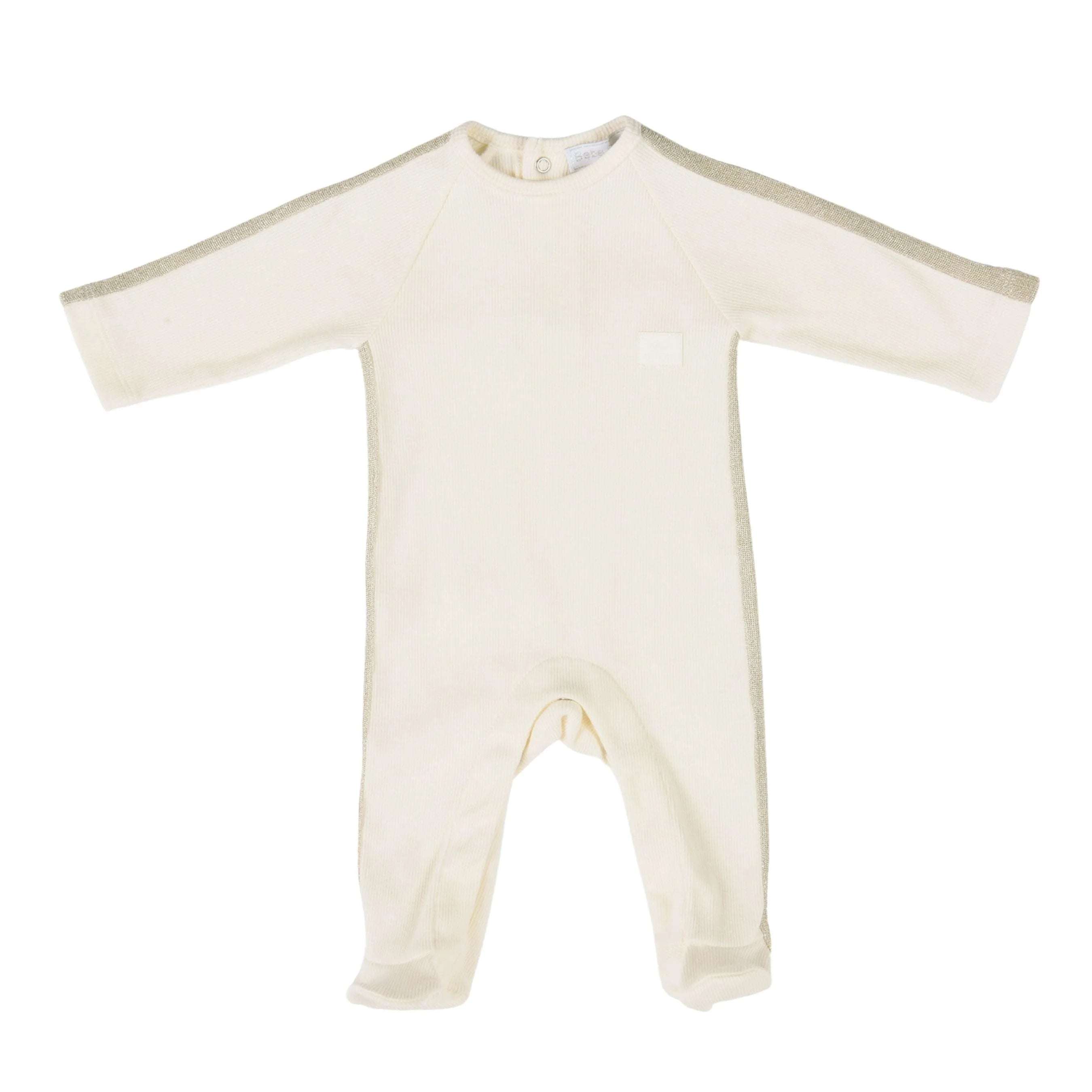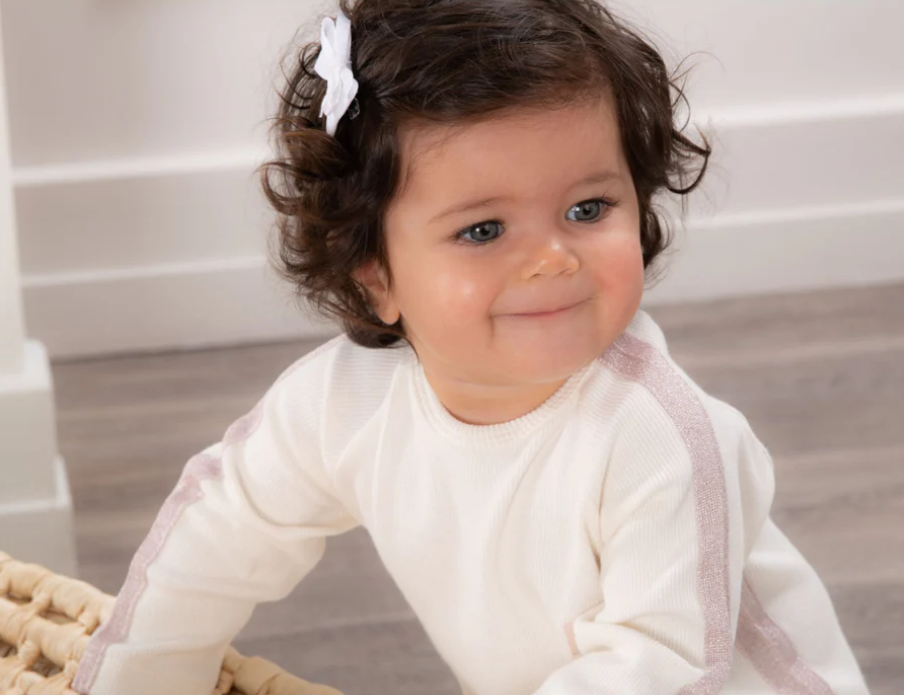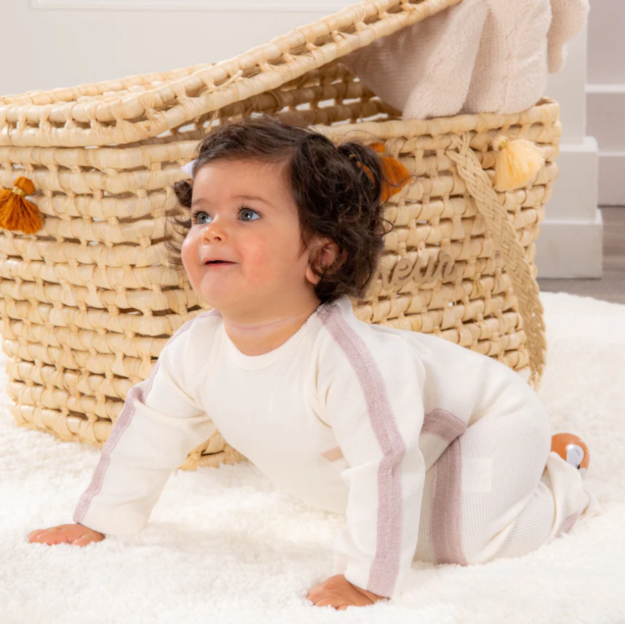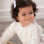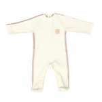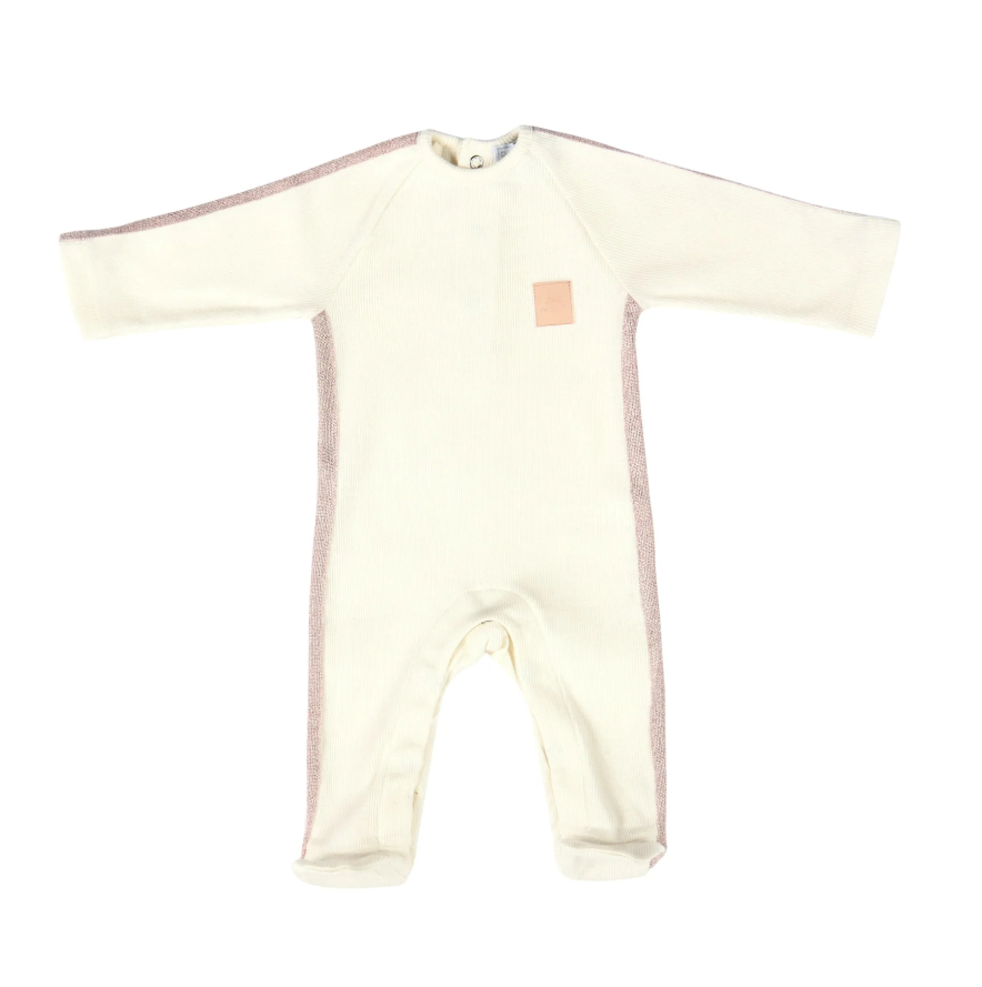 Elegant ivory babygrow for baby girls and boys made from a soft and flexible ribbed cotton fabric. Features a shiny pink knitted ribbon detailing on the sides and sleeves, as well as a stitched pink leather logo on the chest.