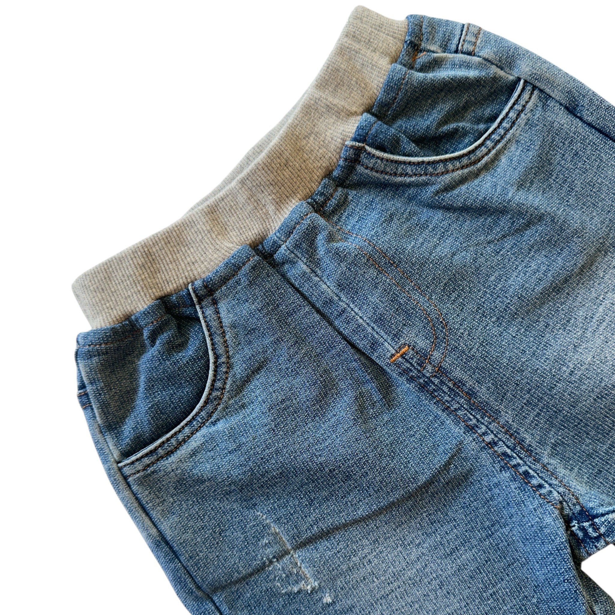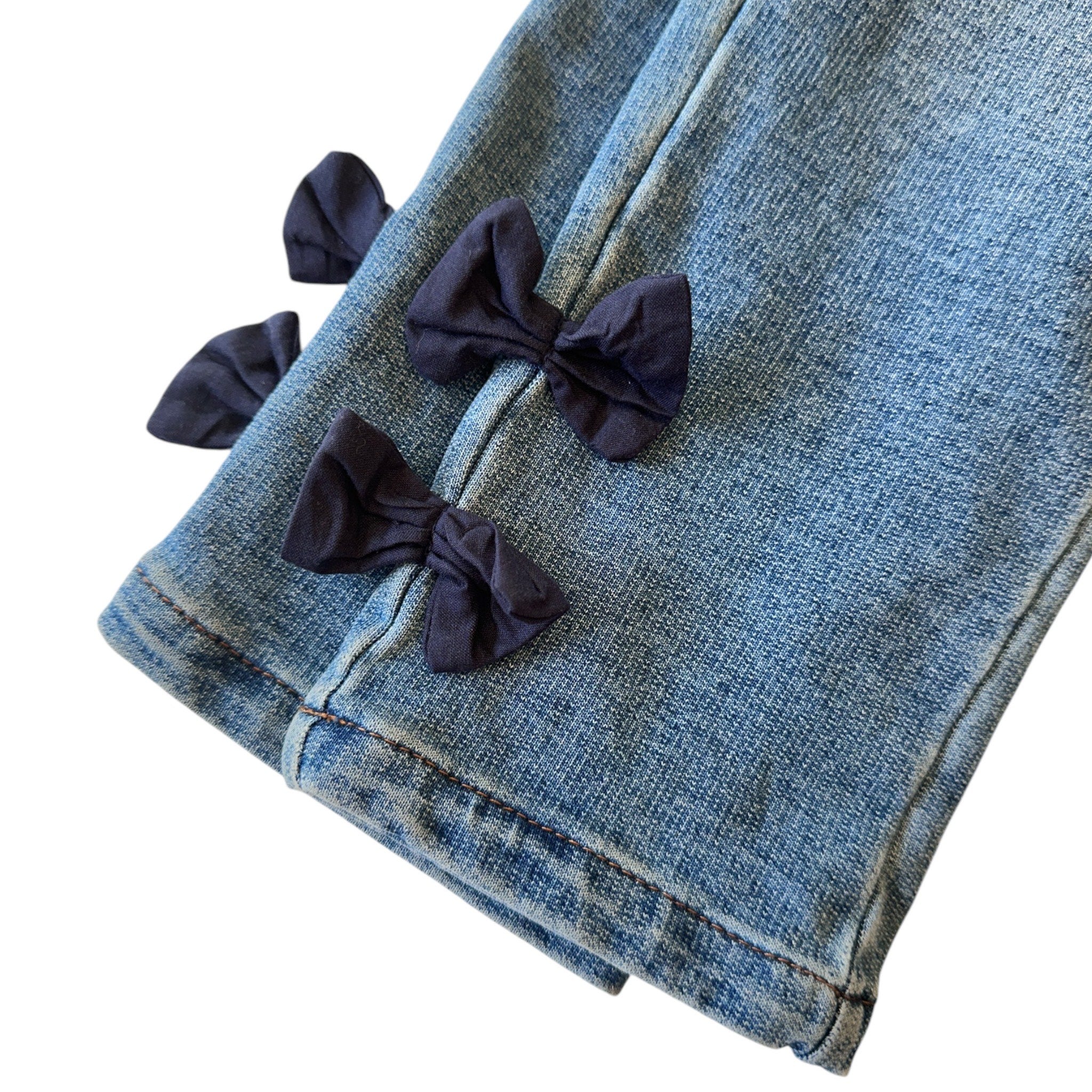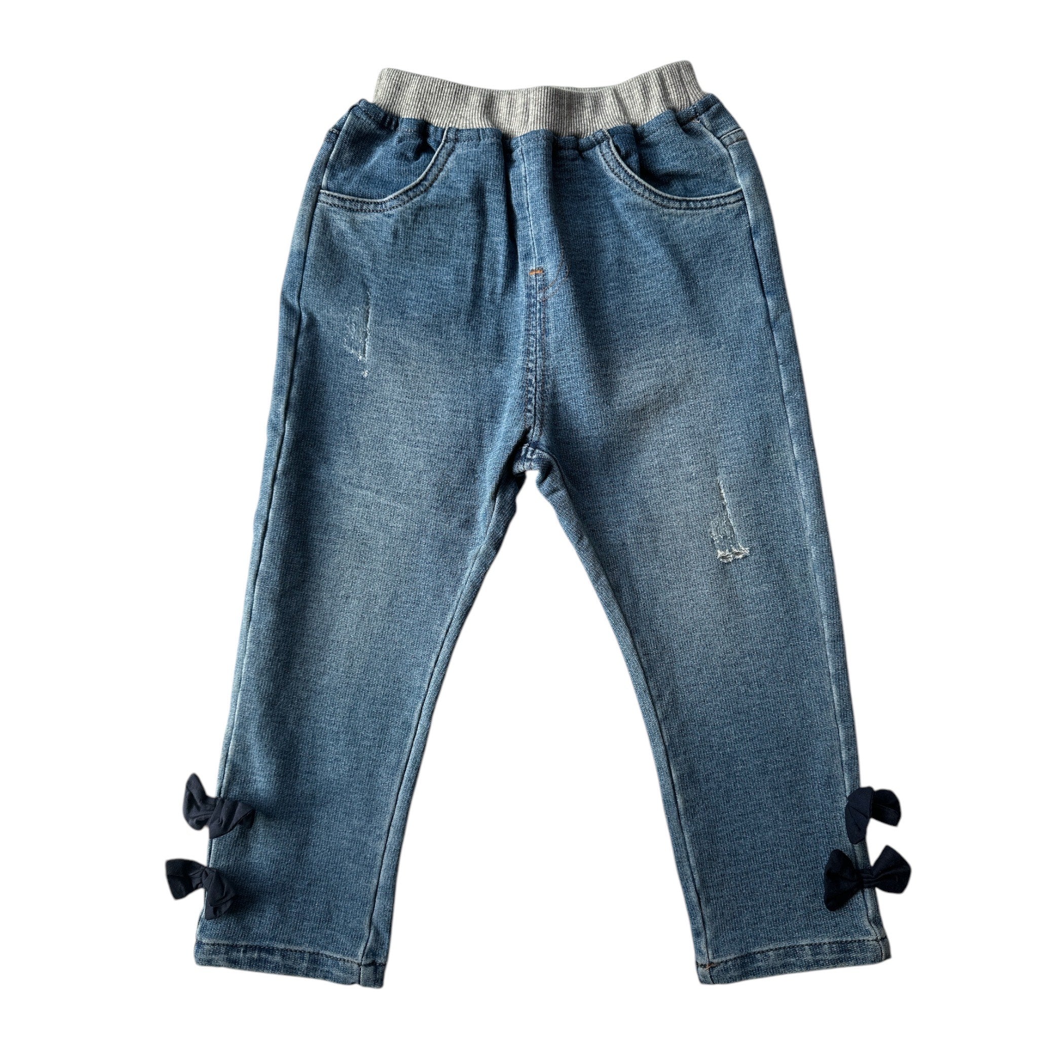 The Aimama Bow-Detail Denim Pants bring a charming twist to classic denim for children 12 months to 6 years. Crafted from soft, stretchy denim, they offer a comfortable elastic waistband and a relaxed fit for all-day ease. Subtle distressed details add a touch of vintage style, while delicate bow accents at the cuffs create a playful, feminine finish. Perfect for pairing with cozy sweaters or casual tees, these pants blend practicality with effortless charm.