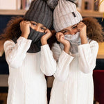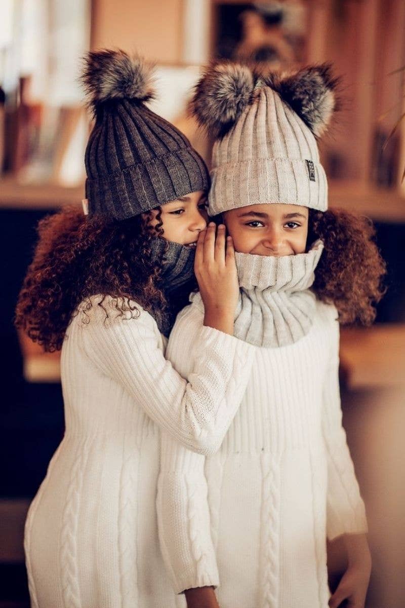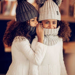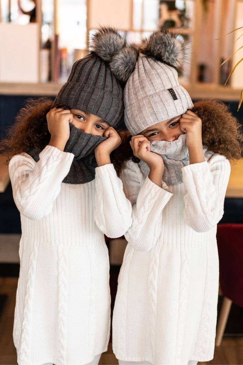 Embrace the winter season in style with the Bianca hat and snood set. Crafted from a luxurious blend of 10% wool and 90% acrylic, this elegant set is designed to keep you warm and stylish. This size is perfect for 5 to 7 year old kids. An additional second layer of fleece will protect you against the cold, and the soft pom-poms adds a touch of charm to your winter ensemble. Whether you're strolling through snowy streets or sipping hot cocoa by the fireplace, this set is a winter essential. Avalible in black, light gray, or dark grey color options.