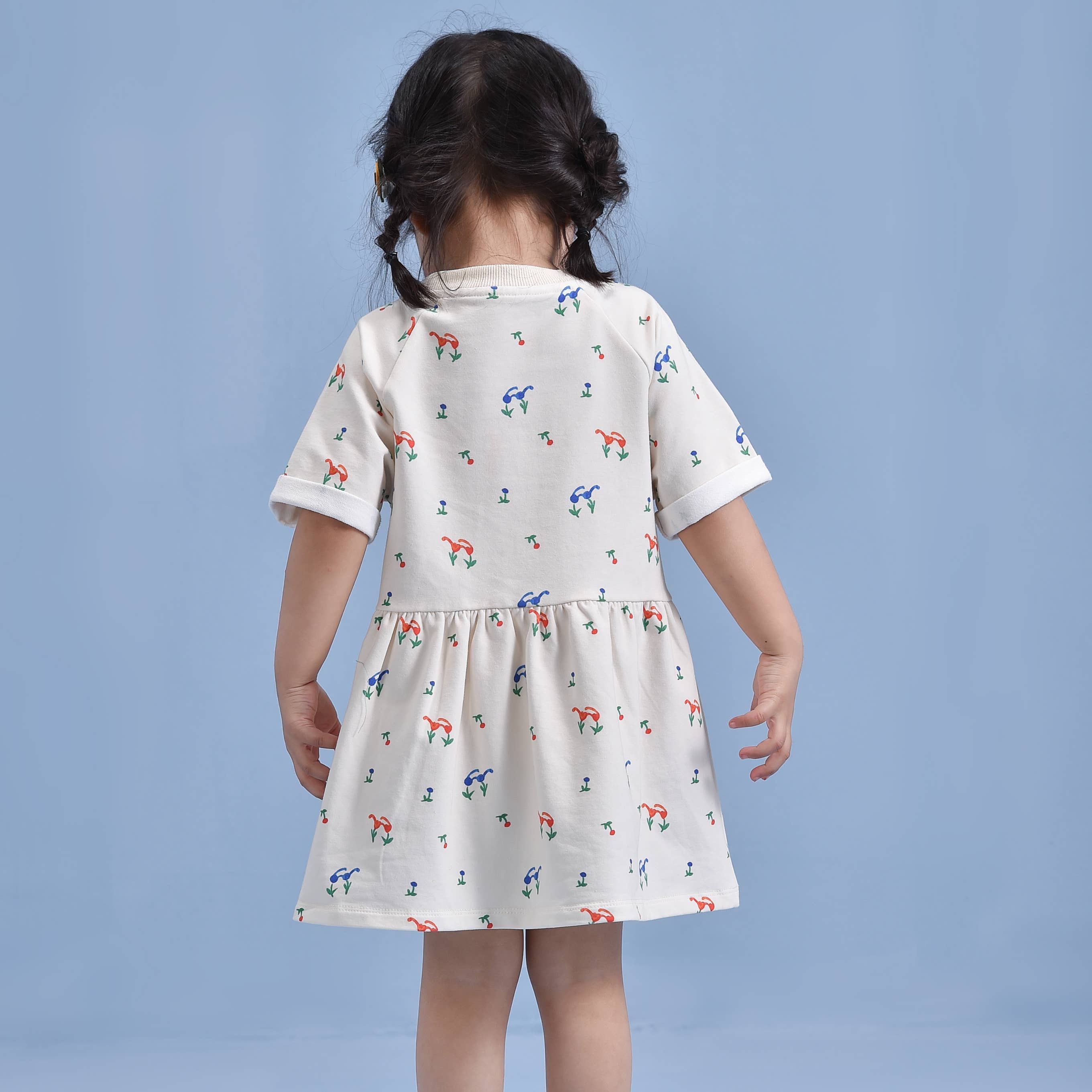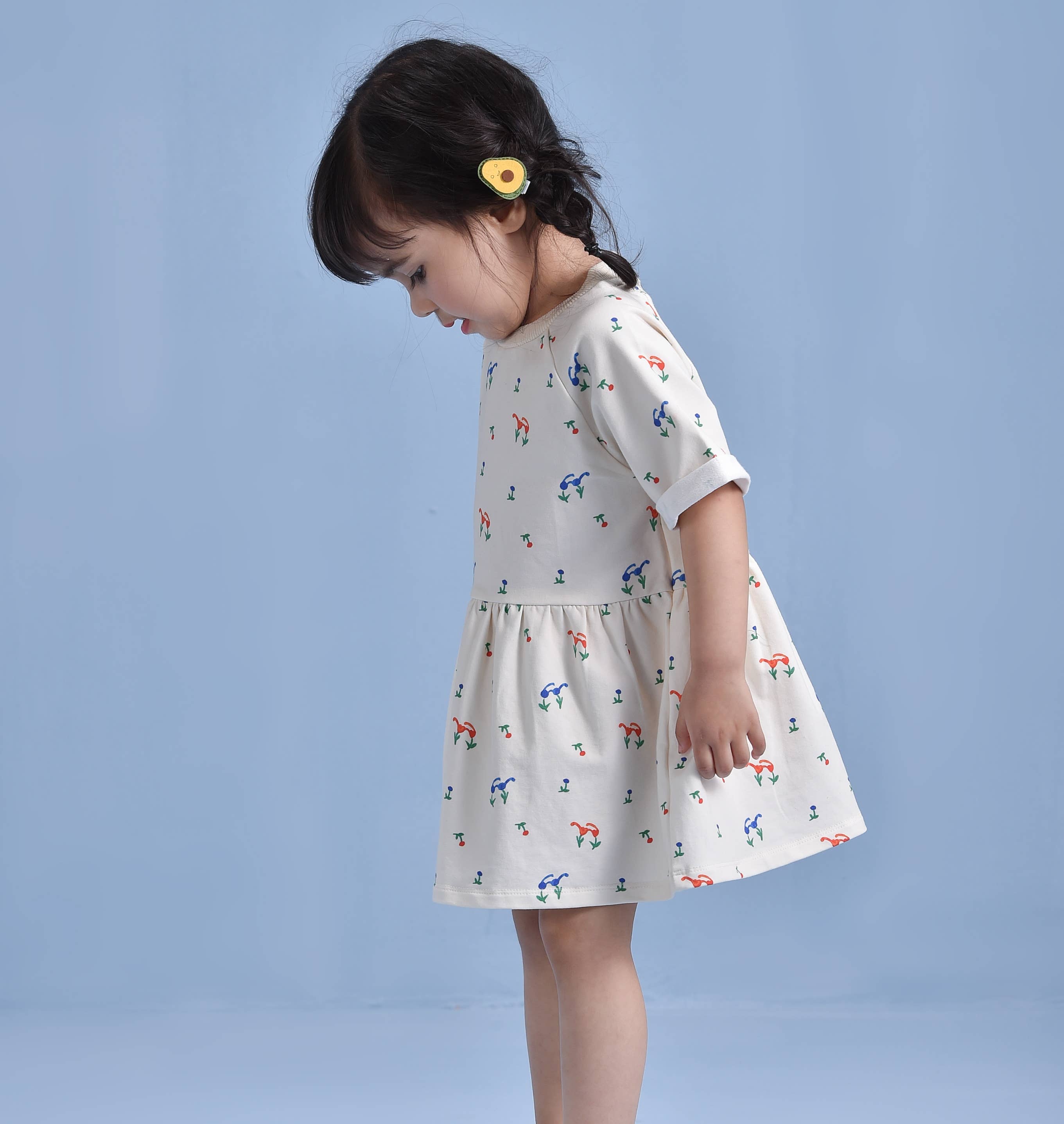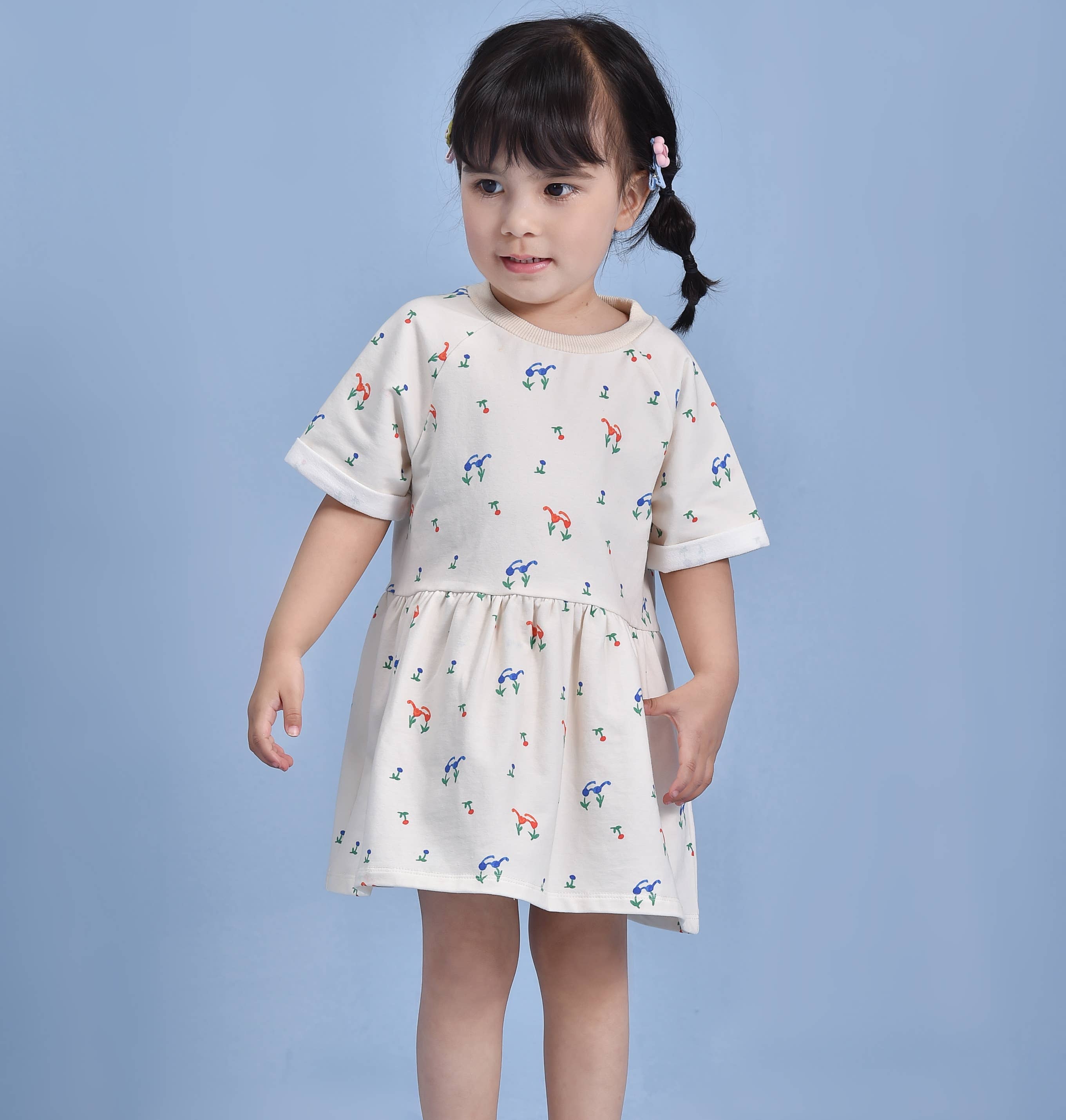 The Aimama Cherry Glasses Print Jersey Dress is a fun and stylish pick for little ones aged 12 months to 5 years. Made from a soft and stretchy blend of 93% cotton and 7% spandex, this dress offers a cozy yet breathable fit. Featuring an all-over cherry glasses print on a beige background, it adds a playful and unique touch to any wardrobe. The round neckline and rolled-up short sleeves give it a casual yet polished look, while the thick material ensures comfort and durability. Perfect for everyday wear, playdates, or special outings!