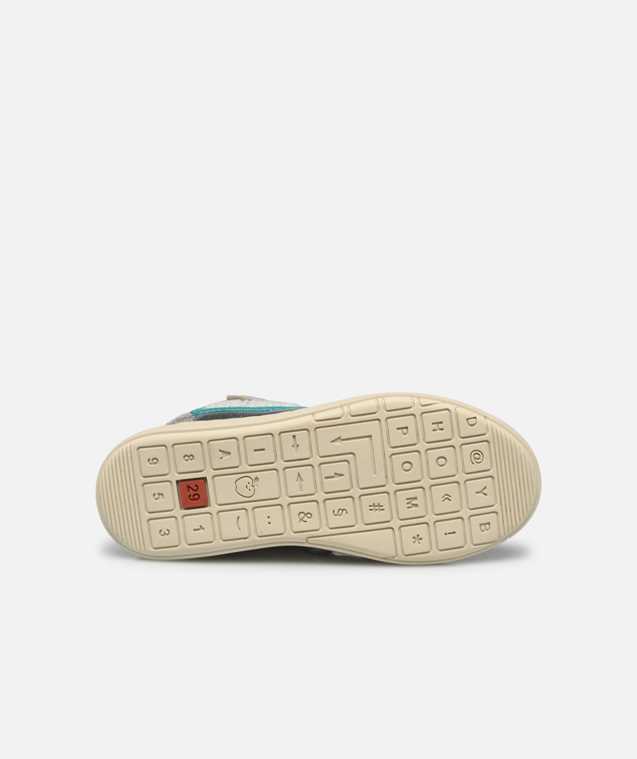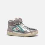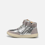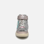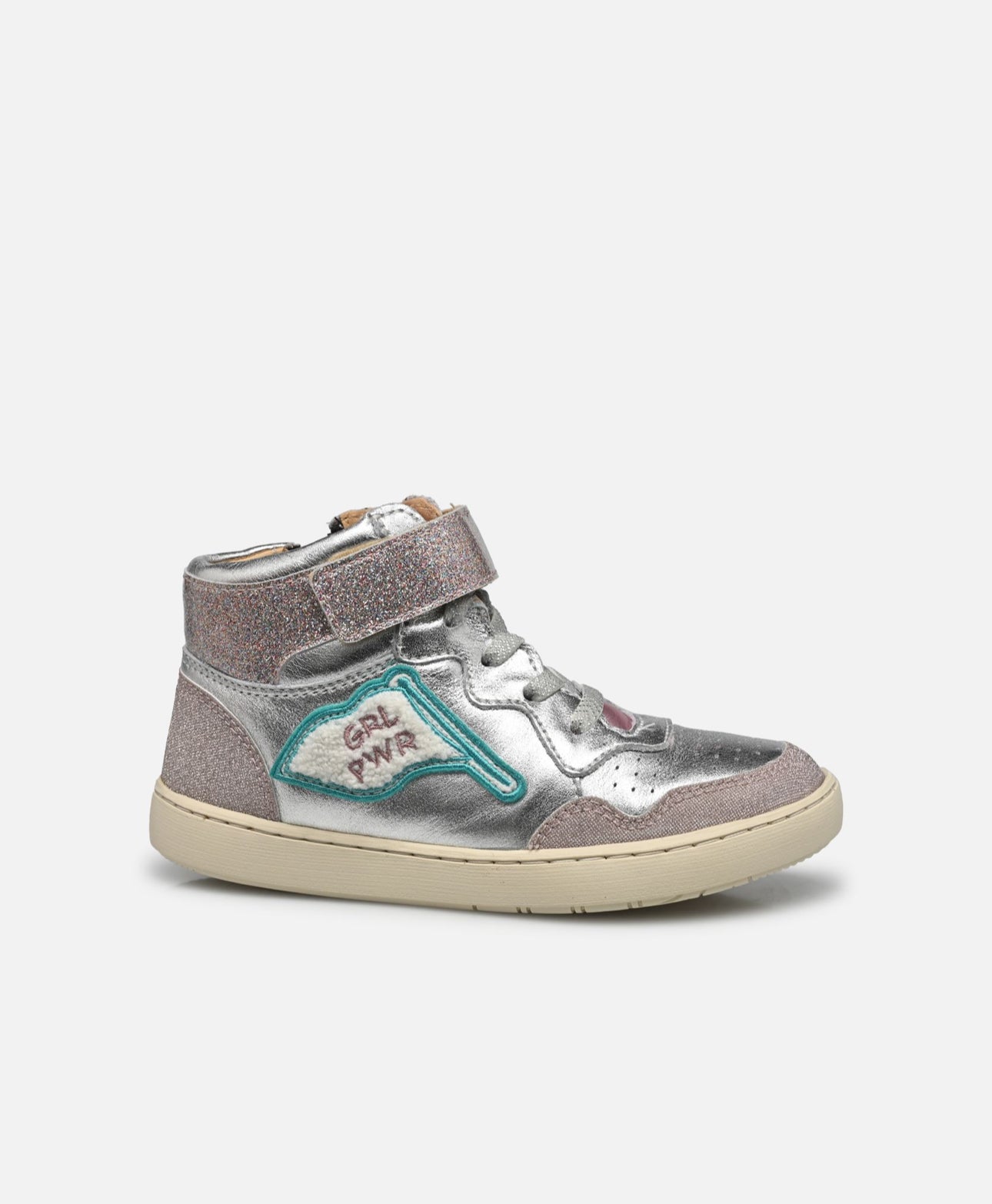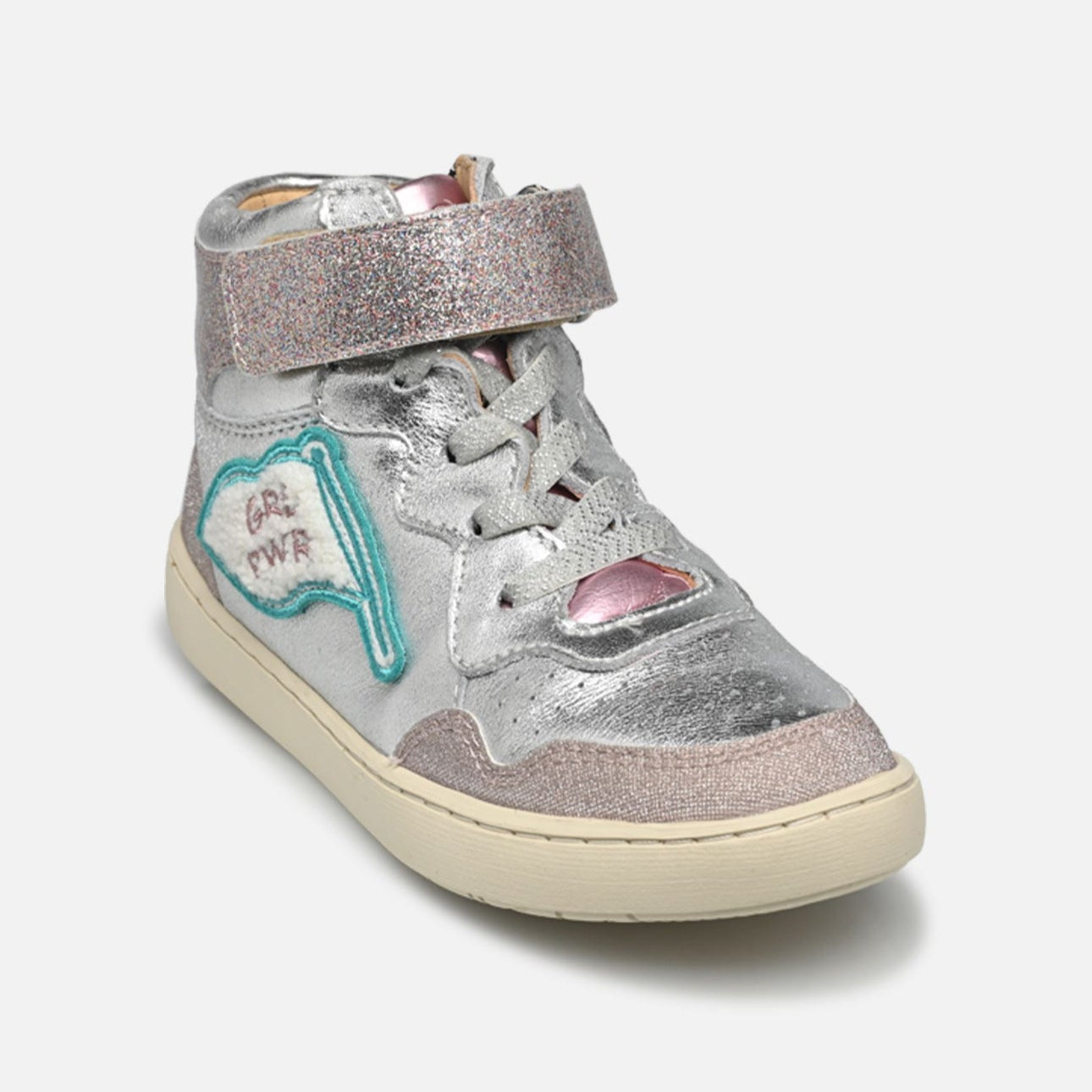 The Shoo Pom high-top sneakers are a bold mix of comfort and style, designed to support little feet with a fun, eye-catching look. Featuring a metallic silver finish, glittery details, and an embroidered "GRL PWR" patch, these sneakers bring a playful, empowering touch to any outfit. The padded collar, secure Velcro strap, and lace-up front provide a snug and supportive fit, while the lightweight, flexible sole ensures all-day comfort. Crafted with high-quality materials and thoughtful design, these stylish sneakers are perfect for active kids who love to stand out.