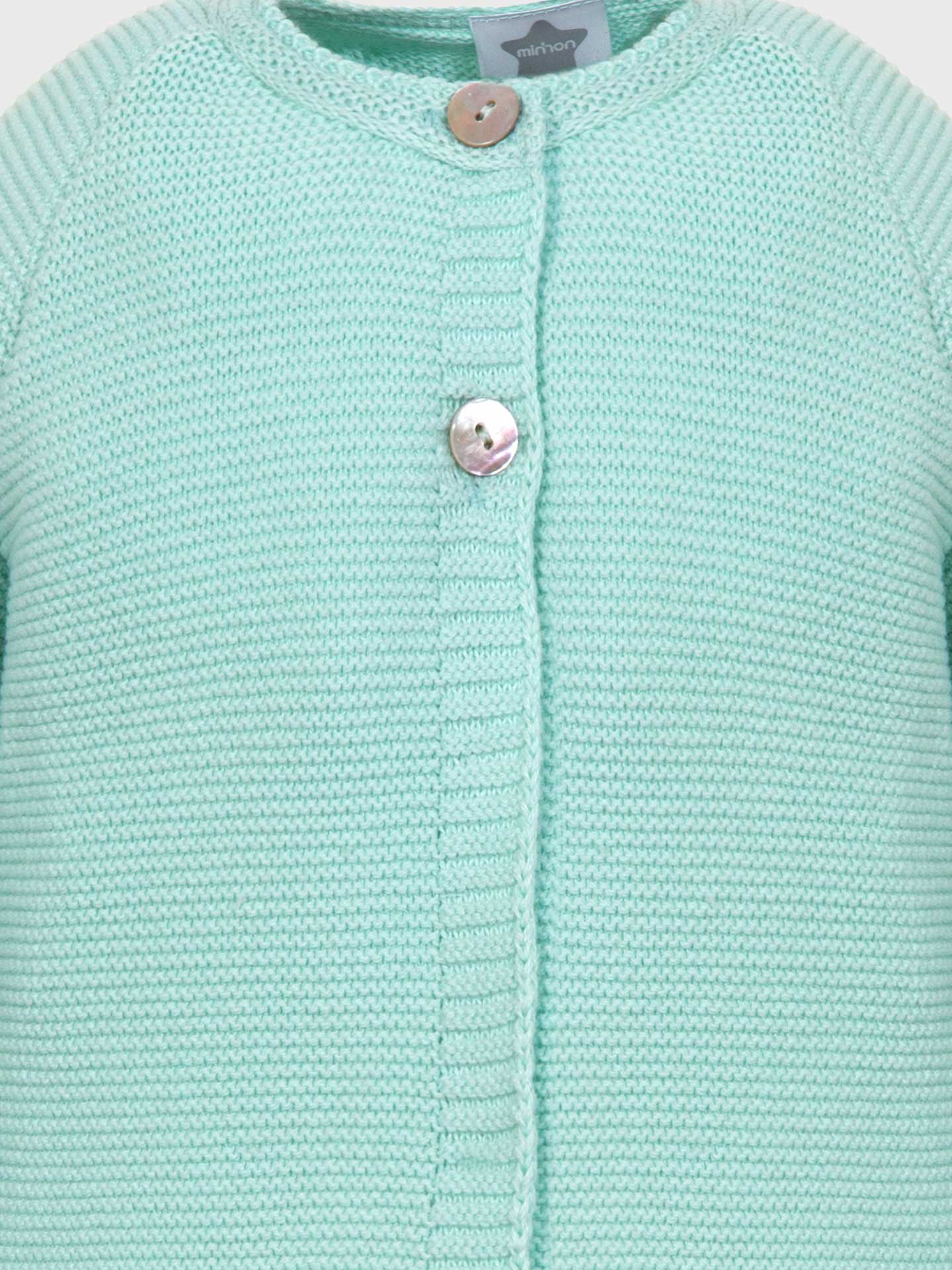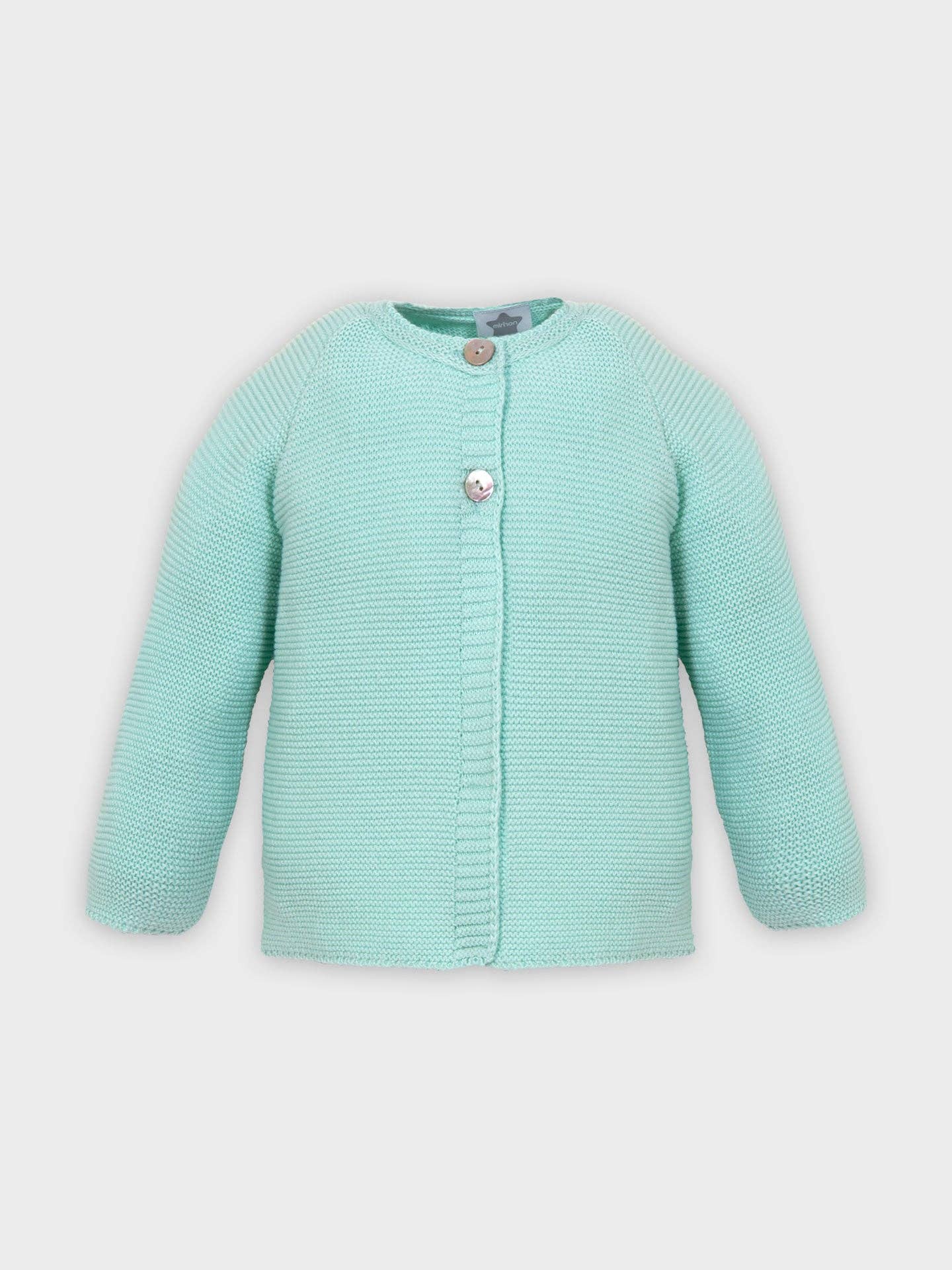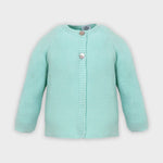Long sleeve knitted jacket in soft cotton knit, ideal for baby girls, up to 36 months. The jacket fastens at the front with two mother-of-pearl buttons. Coat with round neck.