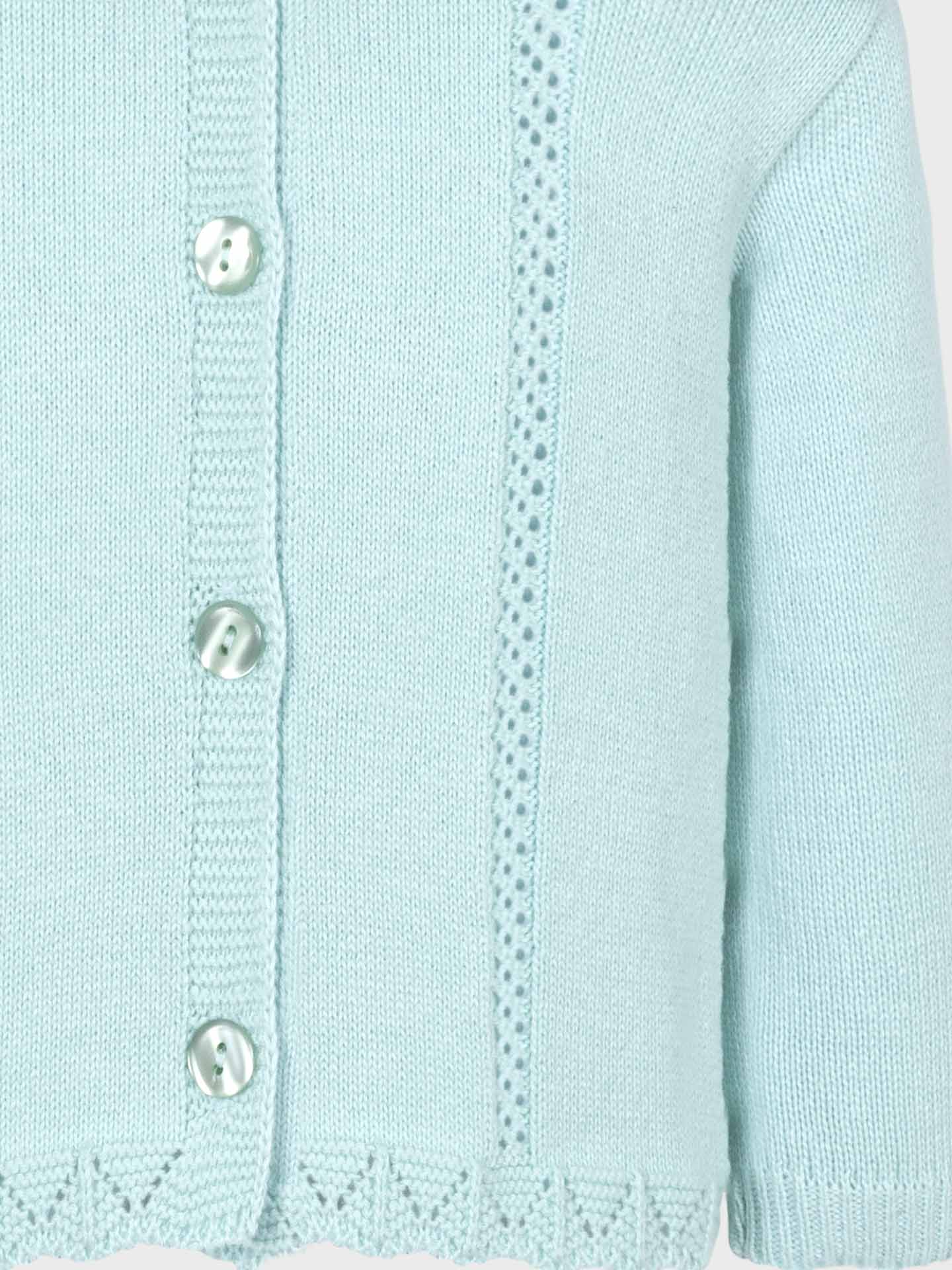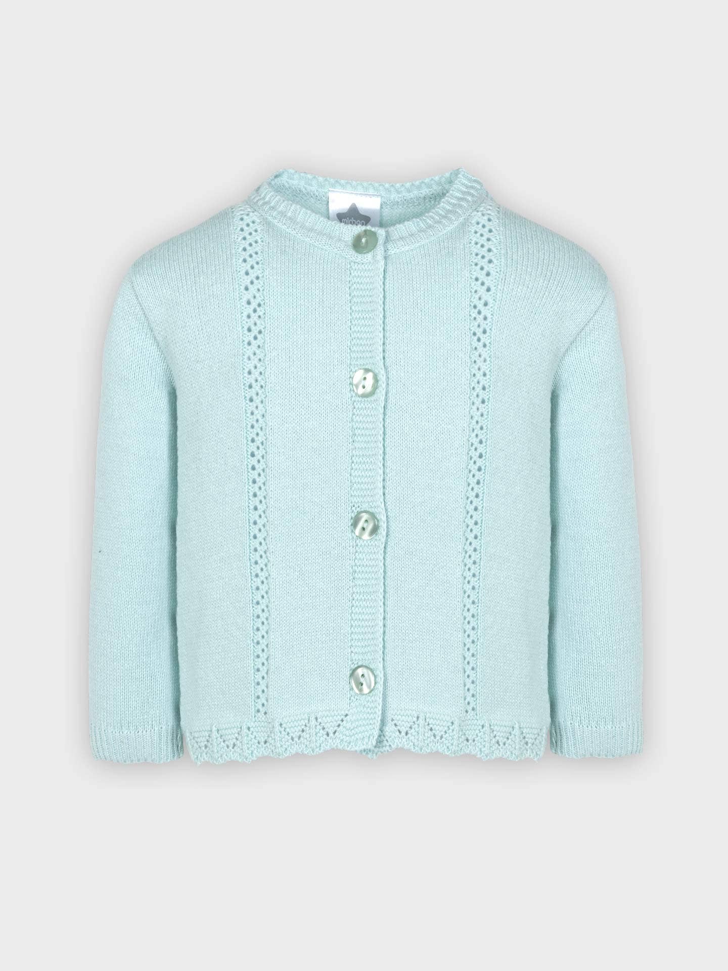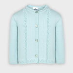 Long sleeve jacket knitted in soft cotton knit, ideal for baby girls, up to 24 months. The jacket fastens on the front with wooden buttons.
