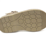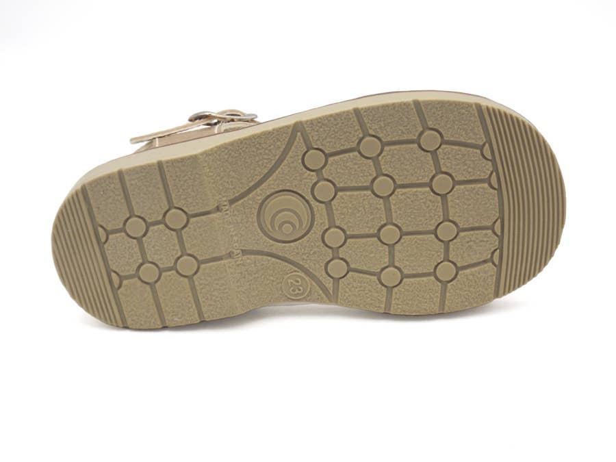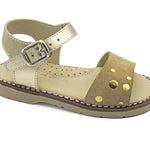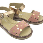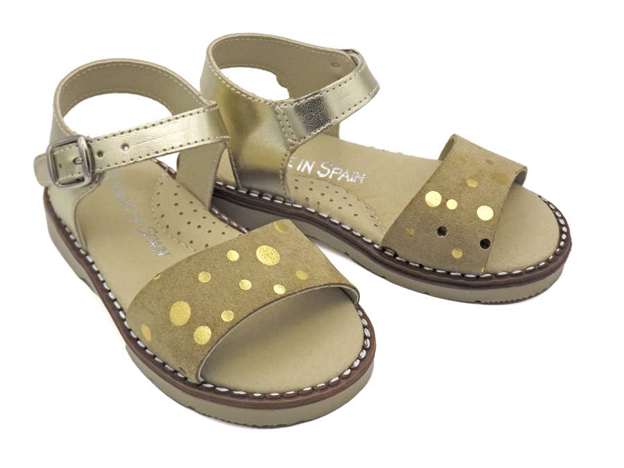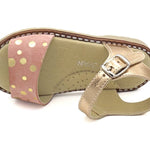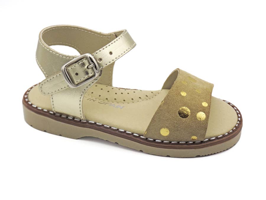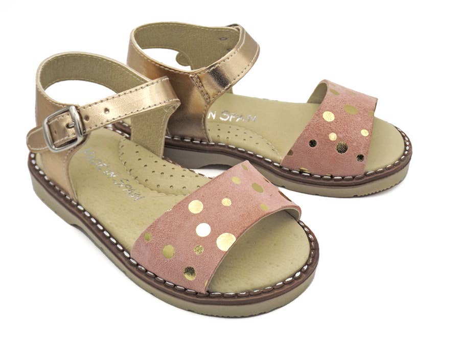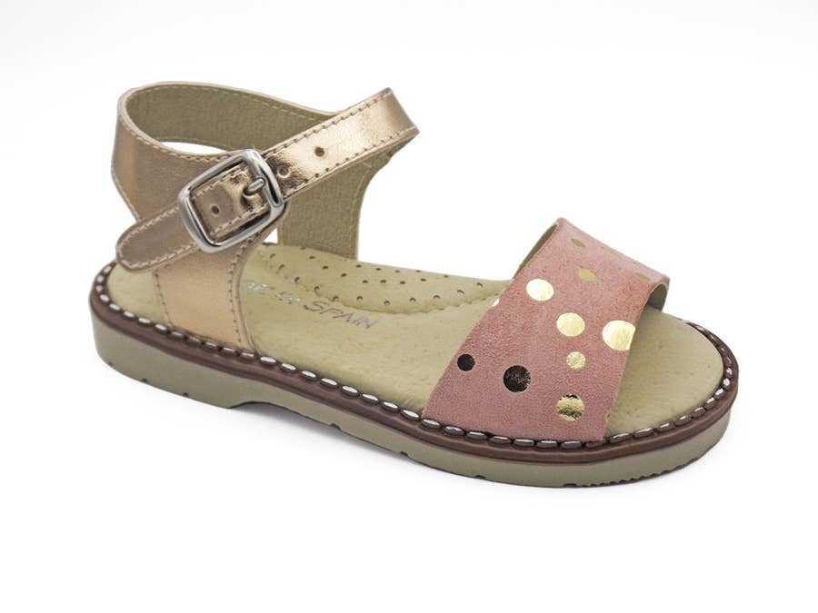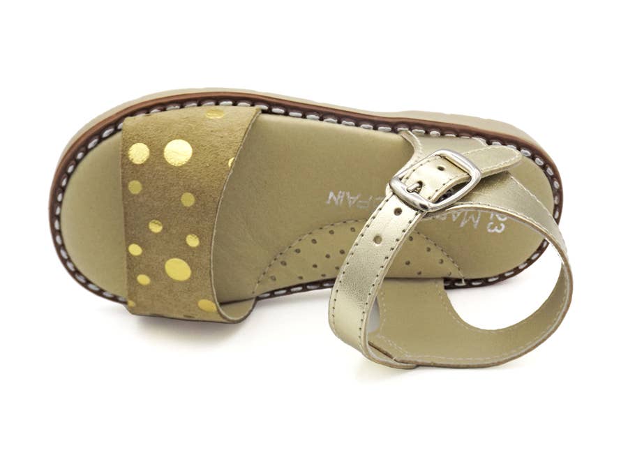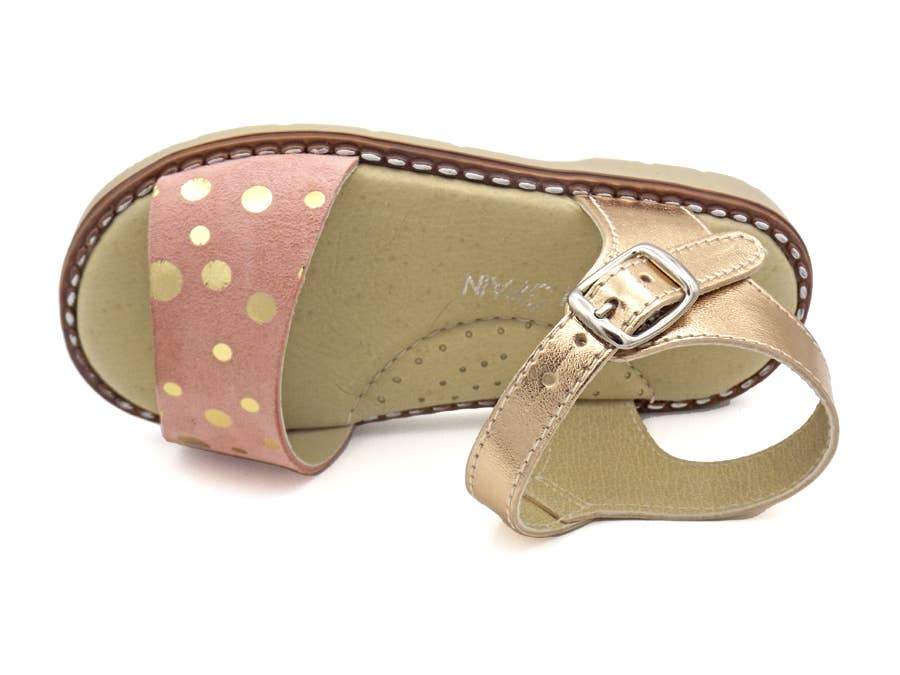 Lydia style classic-line children's sandal made of suede type material with polka dot or polka dot design. Metallic textured ankle strap closure.