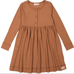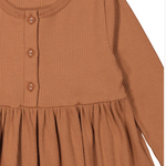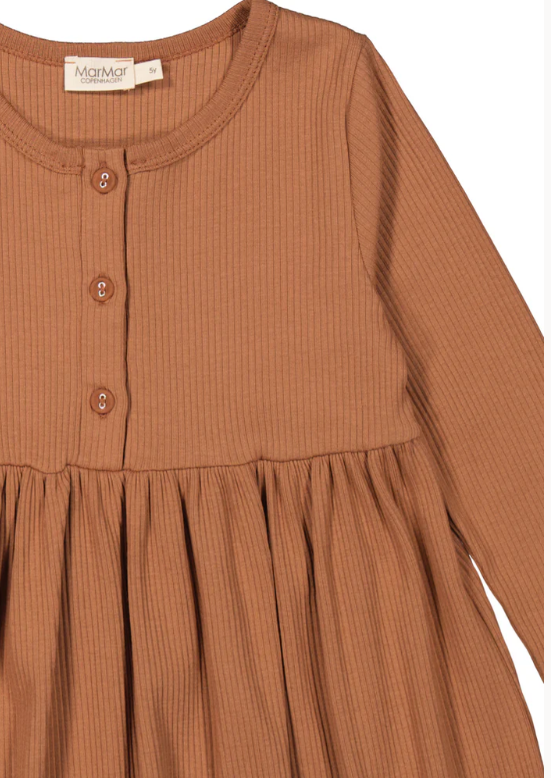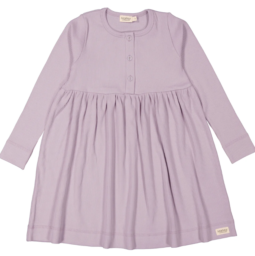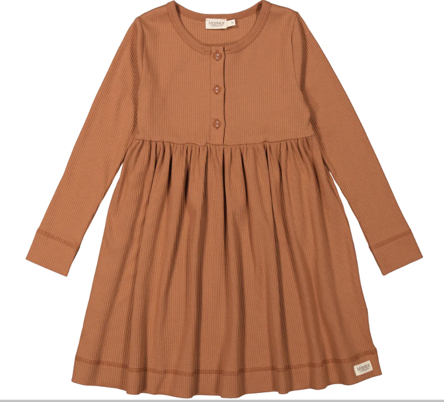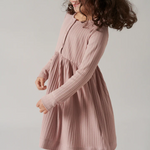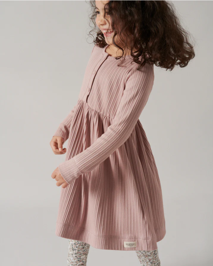 Long-sleeved kids dress with button closure and a cute skirt. The lenght of the dress goes above the knee. The dress is broad rib knitted, soft, stretchy and comfortable to wear