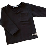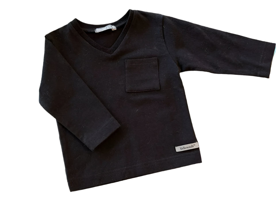 Dress your little one in effortless style and comfort with this sleek black long-sleeve tee from Yellowsub. Made from soft, breathable cotton, this top is perfect for everyday wear, keeping your baby cozy and stylish. Featuring a classic V-neck, a small chest pocket for added charm, and a subtle branded tag, this versatile piece is a must-have for any baby's wardrobe. Avalible for: 0-3M