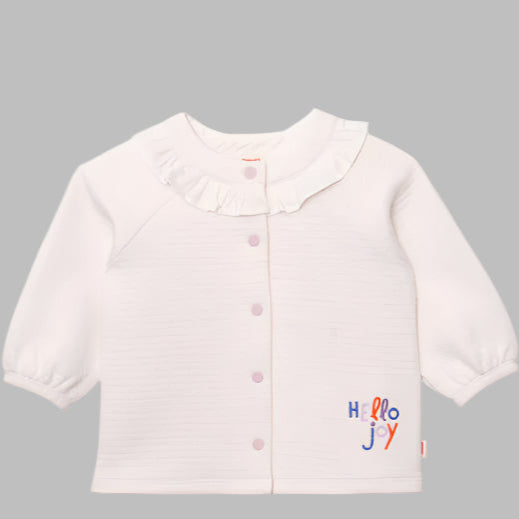 This newborn girl's embroidered cardigan is a delicate and charming piece that adds a touch of elegance to your little one’s wardrobe. Made from soft, breathable fabric, it ensures comfort and warmth while being gentle on sensitive skin. The soft ecru color is neutral, perfect for pairing with a variety of outfits. Beautiful embroidered "hello joy" detailing on the front adds a sweet touch. Featuring a button-down design for easy dressing, this cardigan is both practical and stylish, providing an extra layer of warmth and a polished look for your newborn.
