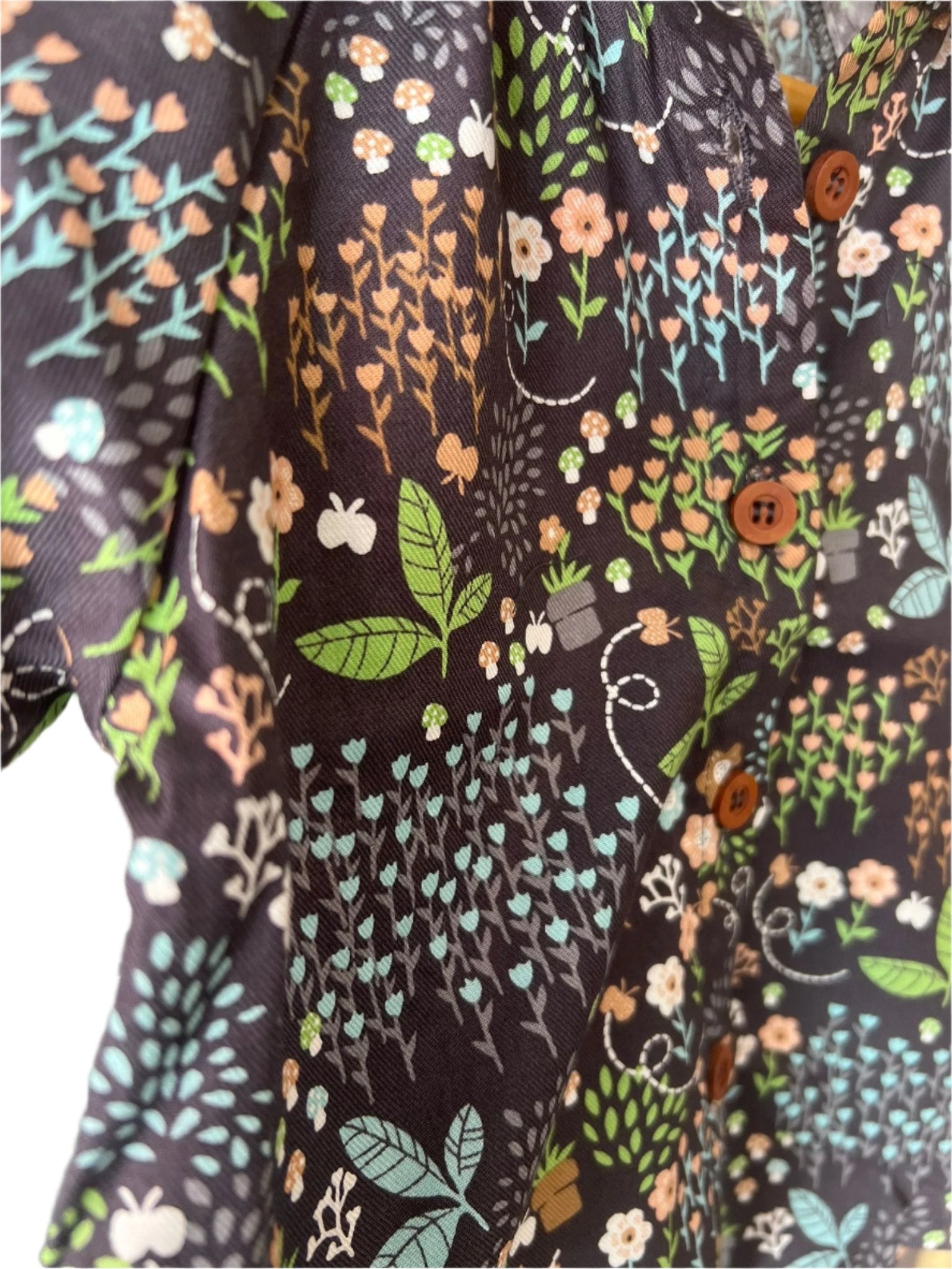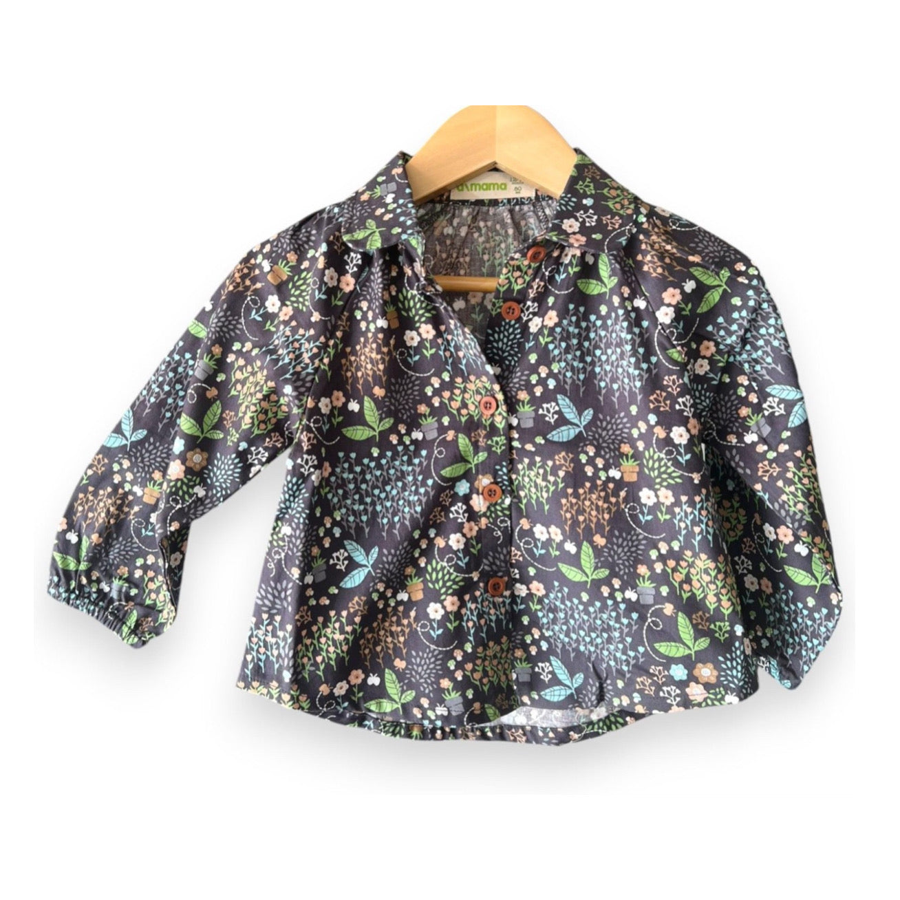 This beautifully designed Aimama button-up shirt is a must-have for little ones who love a touch of nature in their wardrobe. Made from 100% cotton, this lightweight and breathable long-sleeve shirt ensures all-day comfort, making it perfect for layering or wearing on its own. Featuring an enchanting floral garden print on a dark brown base, it combines style with a timeless charm. The wooden button closure adds a classic touch, while the gathered cuffs provide a comfortable yet secure fit. 100% cotton. Available for 12M-6Y olds.