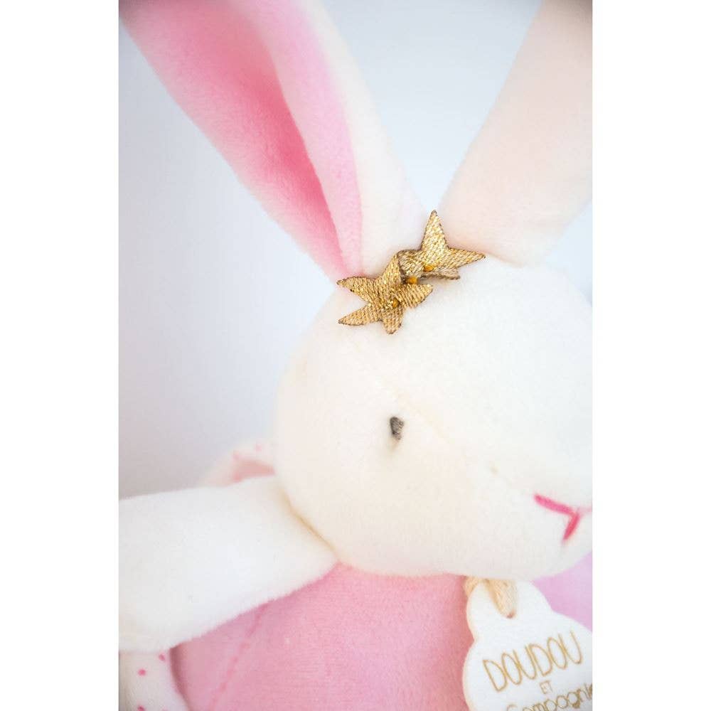 This sweet bunny toy doubles as a music box! Pull the pink round ring to hear the melody. Long ears with pink accents. Two gold stars adorn her head with pink polka dot accents. All Doudou et Compagnie’s products are luxuriously designed with the finest, softest fabrics. Babies and children will be comforted and soothed with the plush bunny friend and her music!
