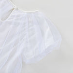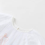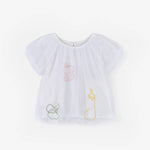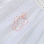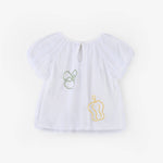 This veggie-embroidered t-shirt is designed with a round neck, short sleeves, and a relaxed fit for all-day comfort. It features a charming combination of a white cotton undershirt and a lightweight mesh overlay adorned with a subtle and sweet veggie-inspired design. The back button closure makes dressing easy, while the soft, breathable materials ensure a cozy feel. Made from 100% cotton with a 100% nylon mesh overlay, this t-shirt is machine washable in cold water (maximum 30°C), making it as practical as it is stylish—perfect for little ones who love a touch of whimsy in their wardrobe!
