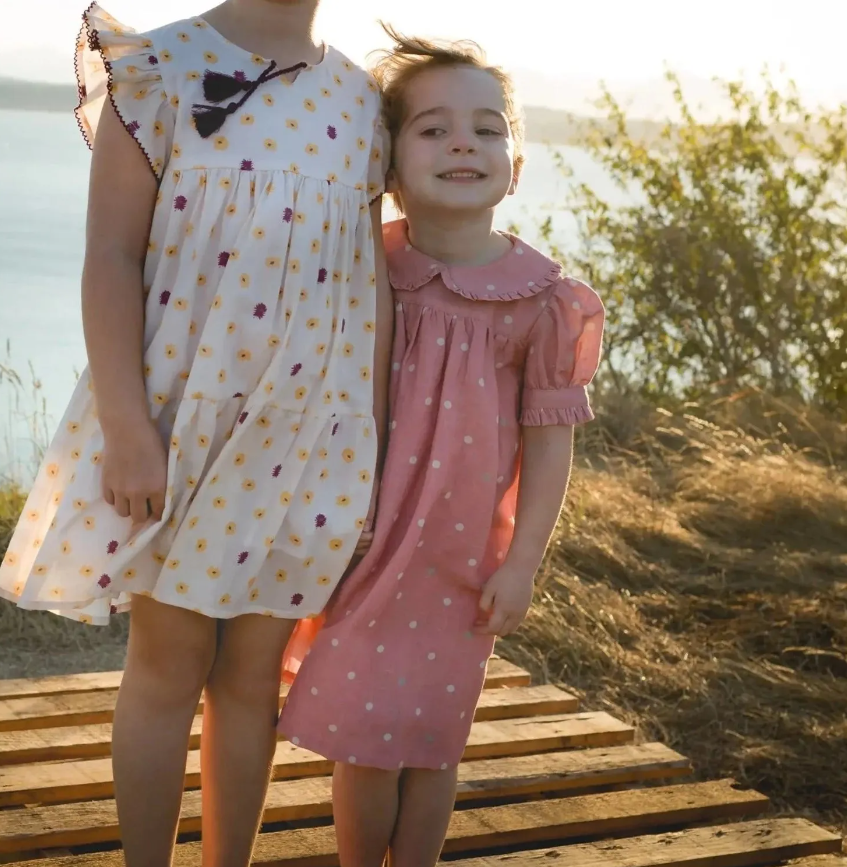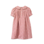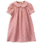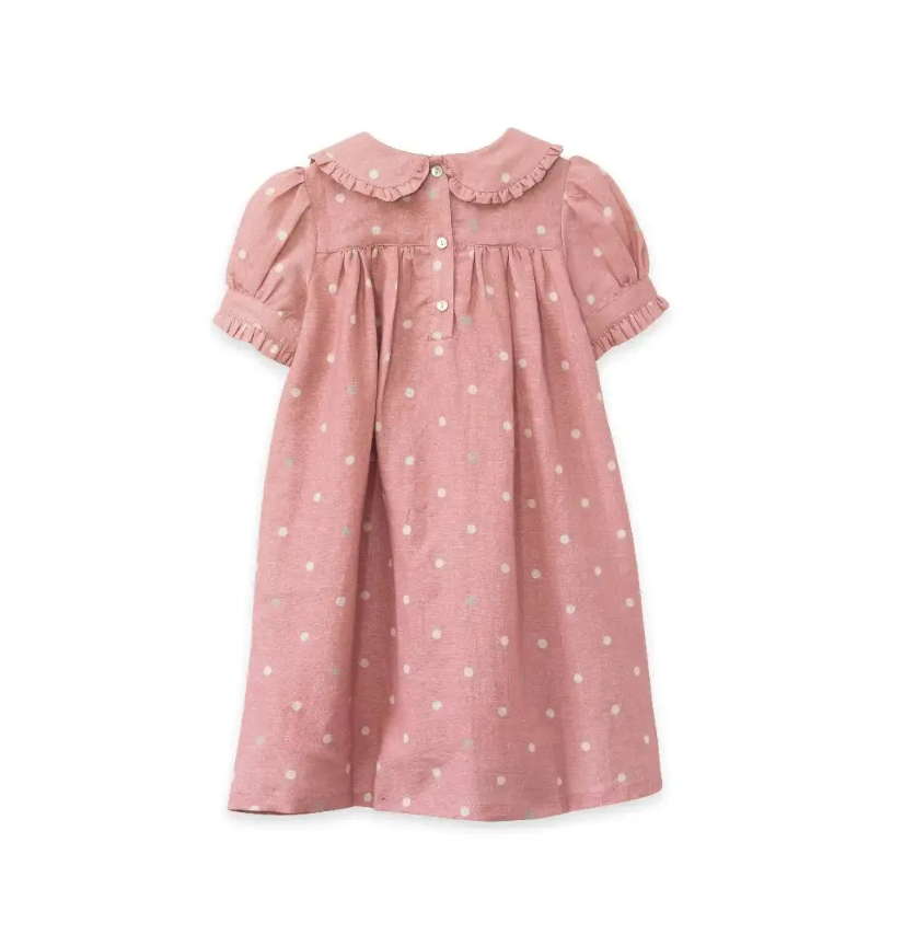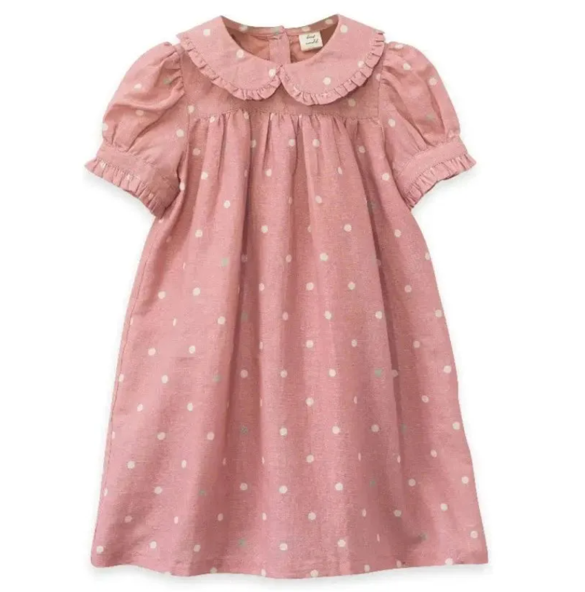 This charming light pink dress features delicate white polka dots and a soft ruffled collar for a touch of elegance. Perfect for special occasions or dress-up days, it’s both playful and sophisticated. Designed by Beet World, this lovely piece is available in size 5–6.