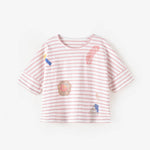 The Aimama Pink & White Striped Oversized Tee is a trendy and comfortable choice for girls aged 5, 7, and 14 years. Made from 100% cotton, this breathable and ultra-soft t-shirt features a relaxed, baggy fit for effortless style and ease of movement. The pink and white horizontal stripes are complemented by a unique all-over pattern print, adding a playful and artistic touch. Designed with medium-length sleeves, this versatile tee is perfect for layering or wearing on its own for a cool and casual look. A must-have for any fashion-forward kid's wardrobe!