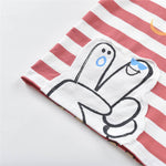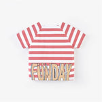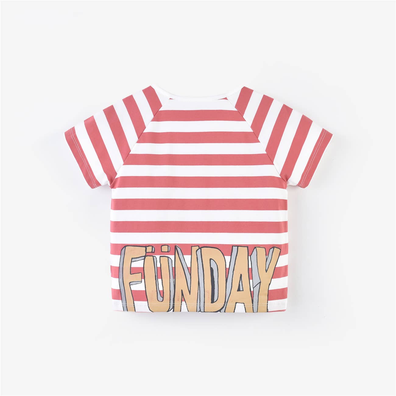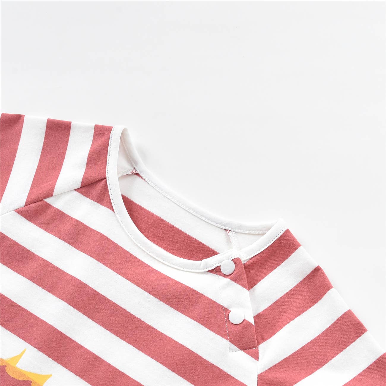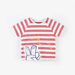 This Aimama vibrant red and white striped tee features a round neck and short sleeves for a classic, comfortable fit. Adorned with a whimsical print on both sides, it adds a touch of playfulness to any outfit. With convenient snaps at the shoulder for quick and hassle-free changing, this versatile tee is perfect for babies to young kids. Available for 12 months - 5 years old.