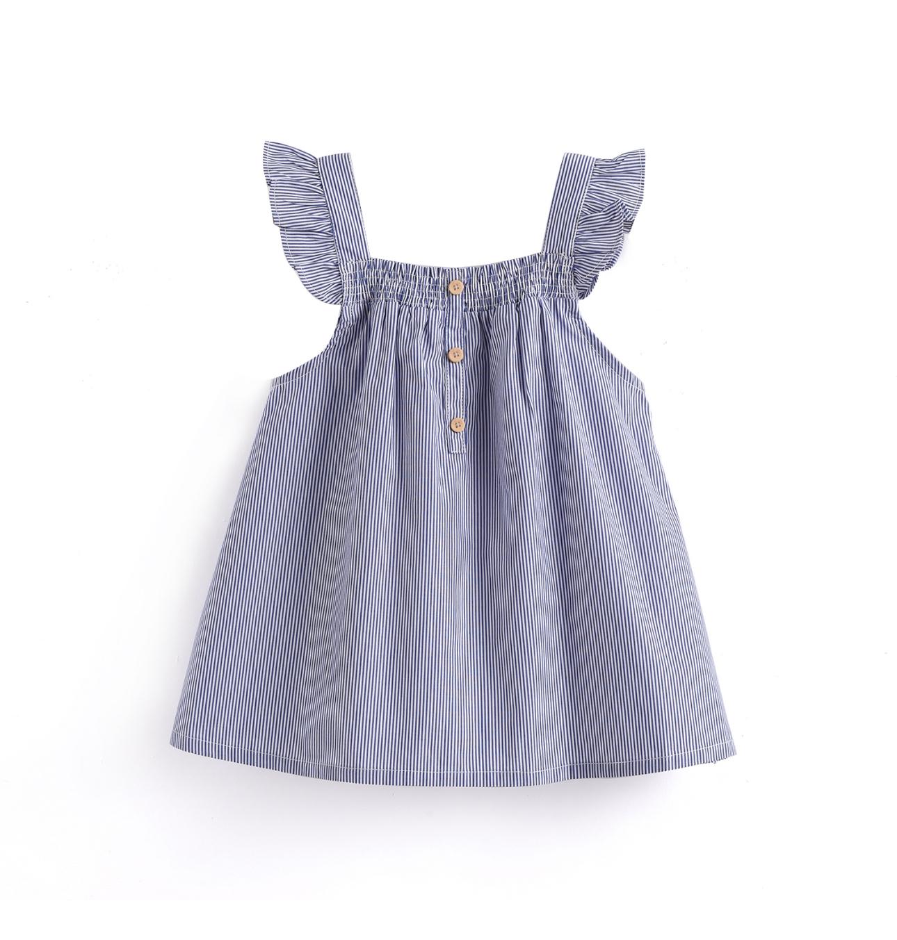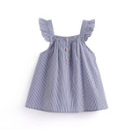 The Aimama Ruffle Tank Top is a charming warm-weather essential for little ones aged 12 months to 6 years. Made from 100% cotton, this airy and breathable top features delicate light blue and white vertical thin stripes for a timeless, classic look. The elastic top ensures a snug yet comfortable fit, while the flowy bottom adds a touch of playful movement. Finished with three light brown buttons down the front and ruffle detailing on the straps, this tank top combines effortless style with everyday comfort—perfect for sunny adventures or layering on cooler days.