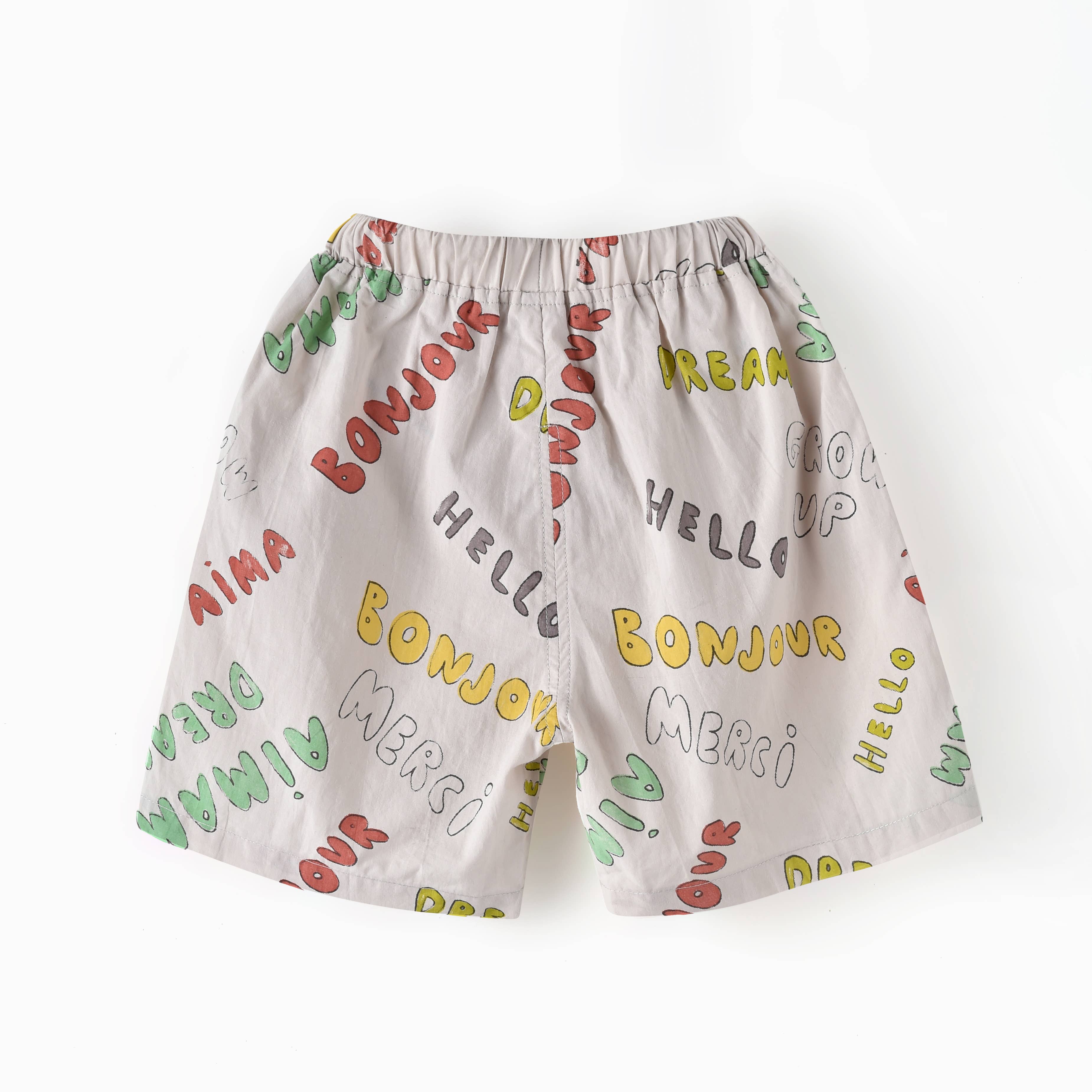 These adorable Sandy Shorts feature a fun "Hello/Bonjour" print all over, making them a cheerful addition to any little one's wardrobe. Designed with an elastic waistband for comfort and ease, plus handy pockets for storing small treasures, these shorts are made from 100% soft cotton. In a neutral beige color, they're perfect for both boys and girls. Available in size 2 years old, these unisex shorts are both stylish and practical.