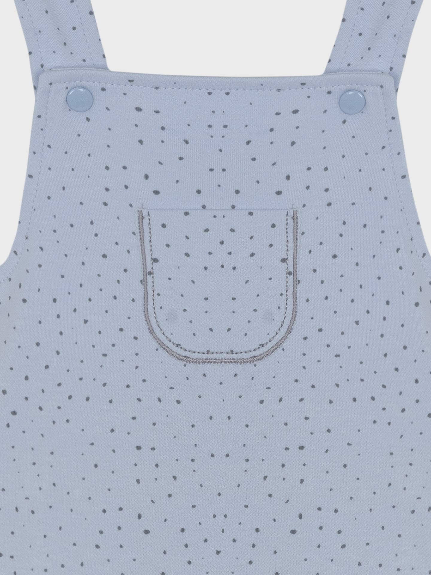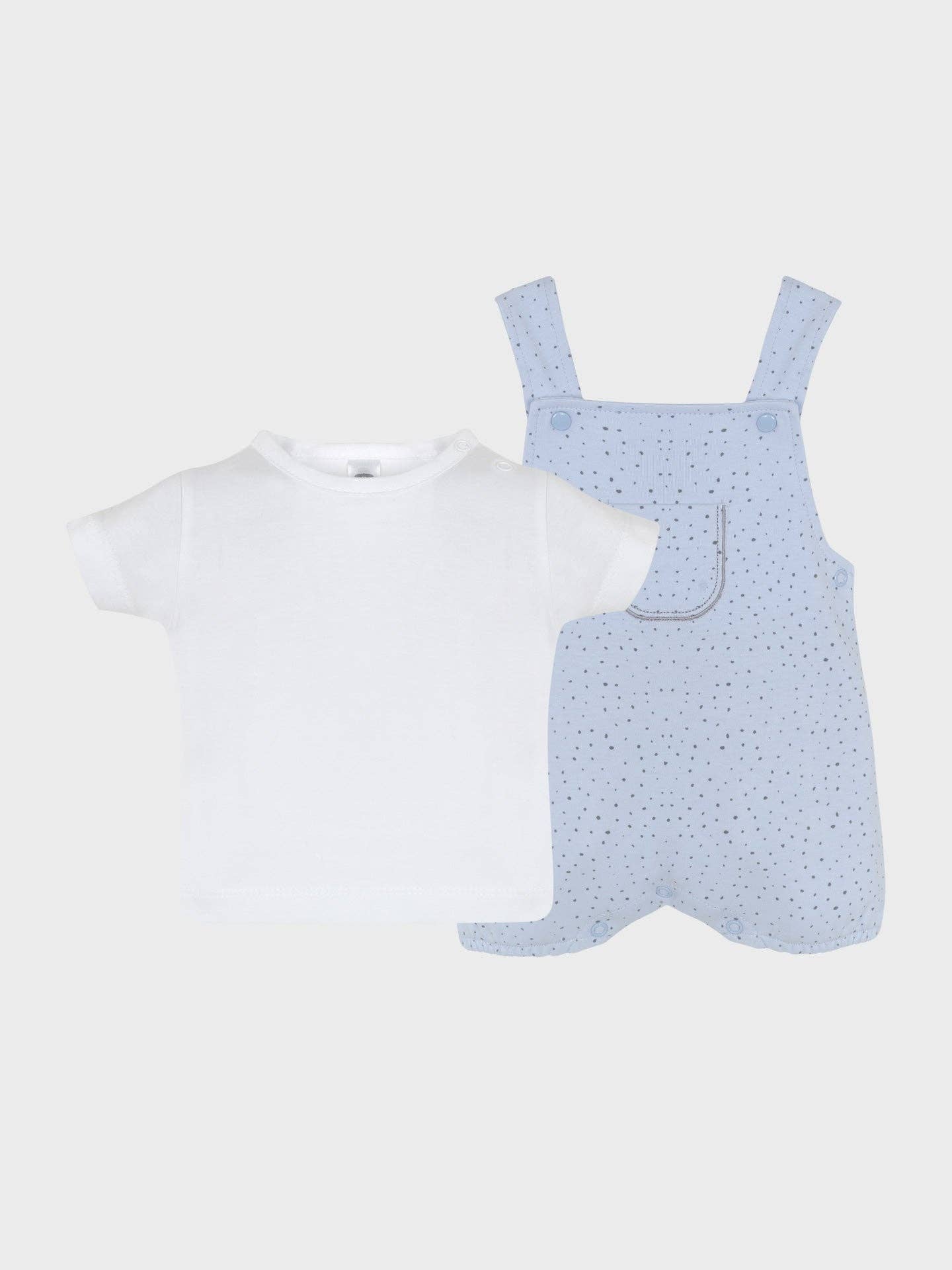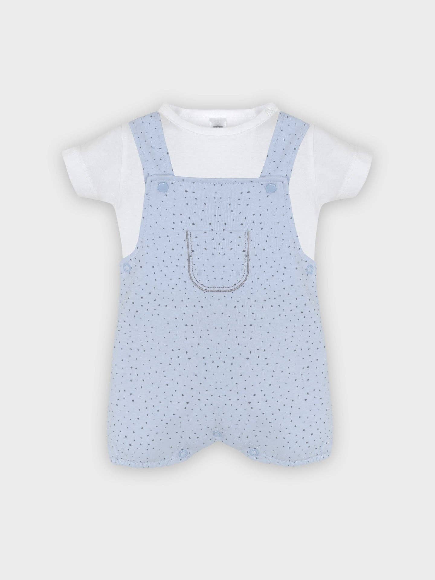 Introducing a charming two-piece cotton set for baby boys up to 12 months, designed for both comfort and style. Crafted from 100% cotton knit, this set includes an adorable blue polka-dot romper with front and bottom snap closures, making dressing and diaper changes a breeze. The matching white removable t-shirt features convenient snap closures on the shoulder and back, ensuring an easy fit. Soft, breathable, and perfect for everyday adventures, this cozy set is a must-have for your little one’s wardrobe.