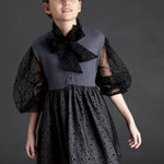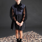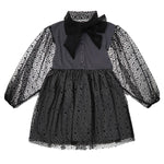 This enchanting black and grey dress by TOCOTO VINTAGE is a magical addition to any little wardrobe. Designed with delicate black tulle ruffle sleeves sprinkled with shimmering stars, it brings a dreamy, celestial charm to every occasion. A soft tulle bow ties elegantly around the neck, while the layered skirt adds volume and movement for a whimsical touch. Buttons down the top half complete the vintage-inspired look. Crafted from a blend of 50% cotton and 50% polyester, this dress offers both comfort and style. Available in sizes 4, 6, and 8 years, it’s a stunning piece that captures TOCOTO VINTAGE’s signature blend of elegance and timeless design.
