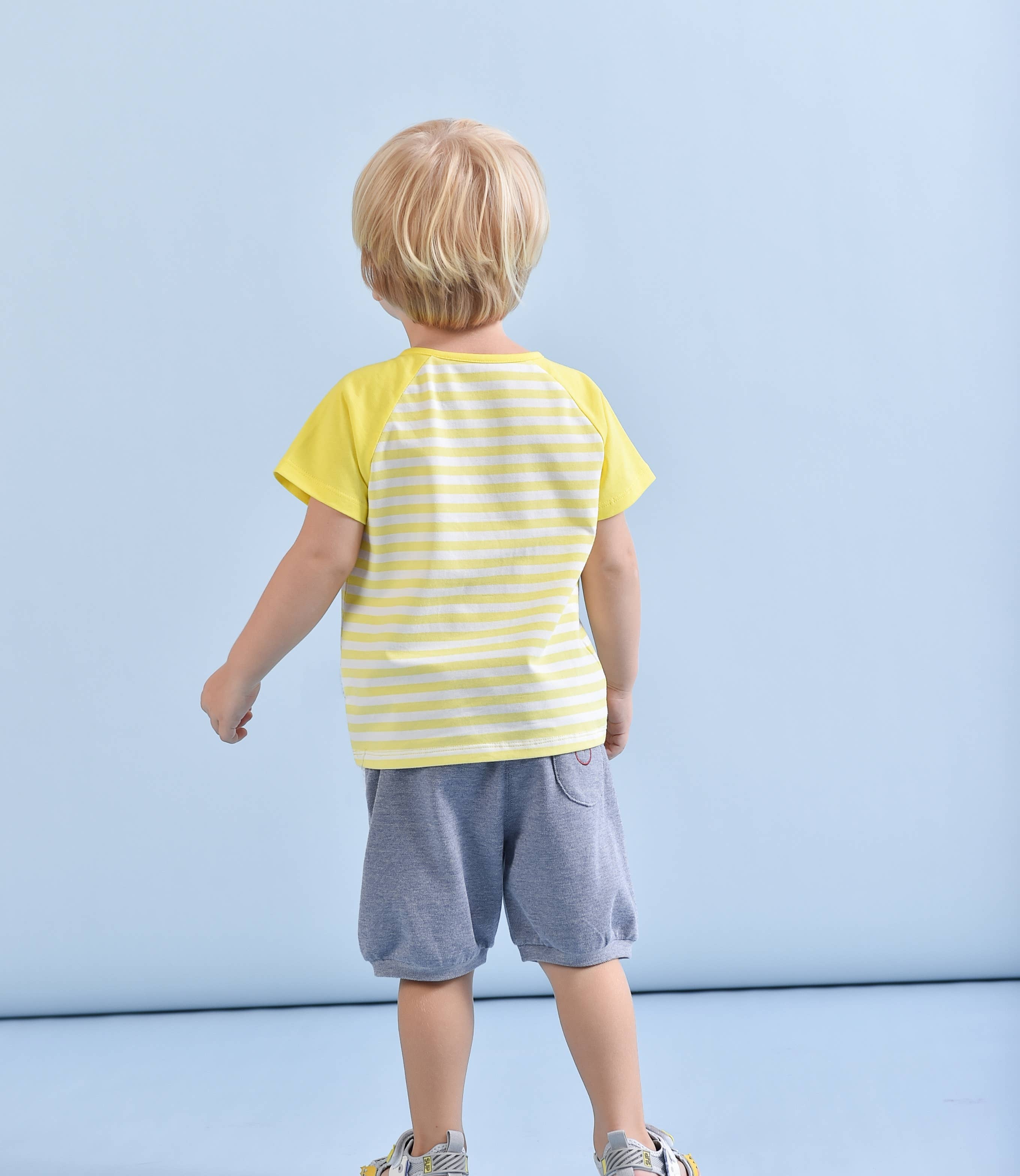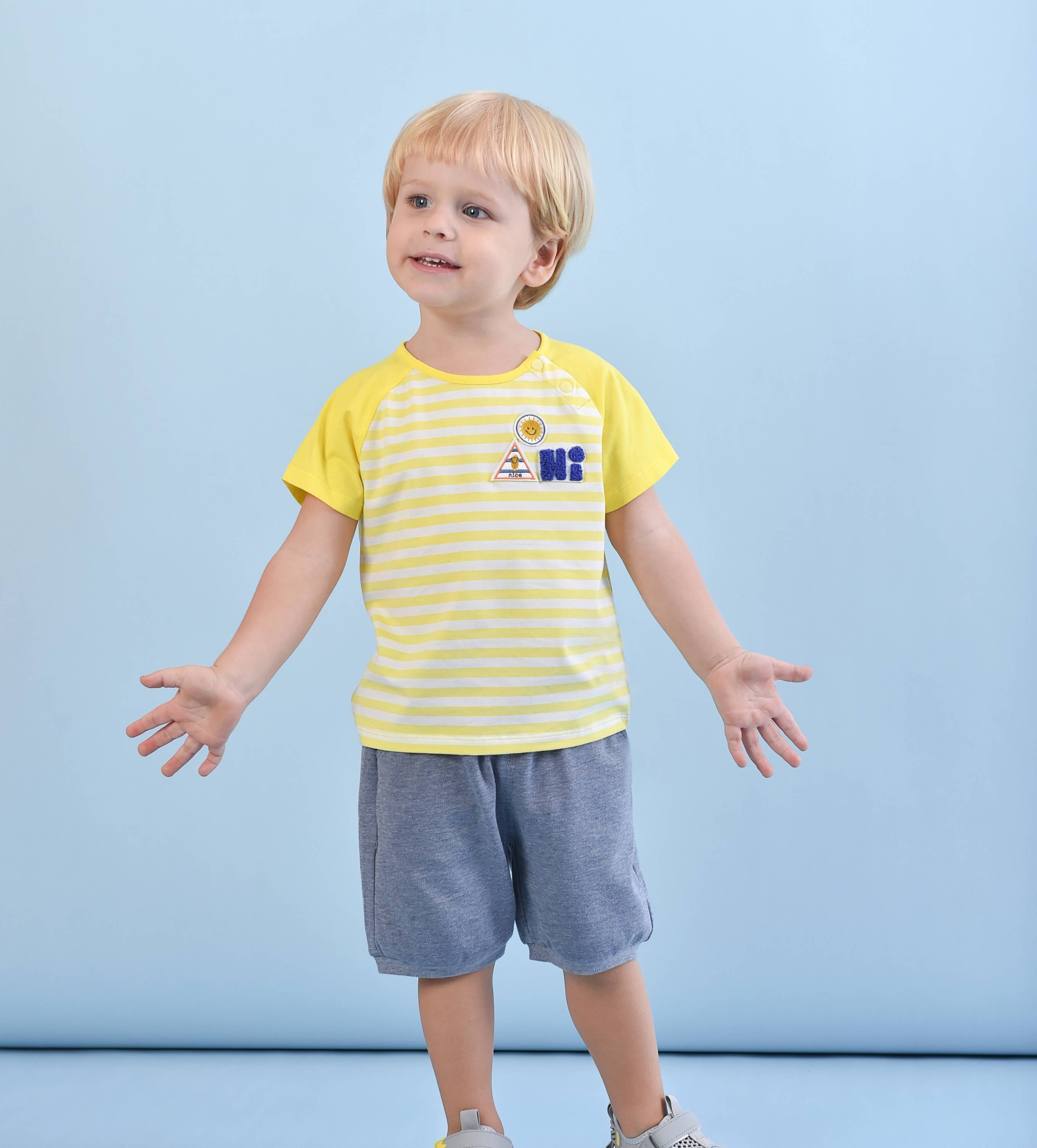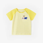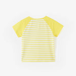 This delightful yellow and white striped t-shirt features adorable colorful embroidered patches with fun, playful designs. Available for 12 month - 5 years old, this tee is a must-have addition to your child's everyday wardrobe. Let your little one enjoy the perfect blend of comfort and style this summer!