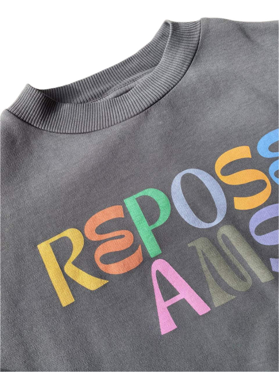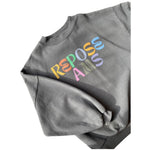 This cozy gray sweater by Repose Ams is the perfect blend of comfort and style. Made from a soft, high-quality fabric, it provides warmth without sacrificing breathability. Featuring a classic design with a crew neck and multicolored branding print, this sweater is versatile enough to be layered over shirts or worn on its own. The relaxed fit offers plenty of freedom of movement! Unisex, size 6 years.