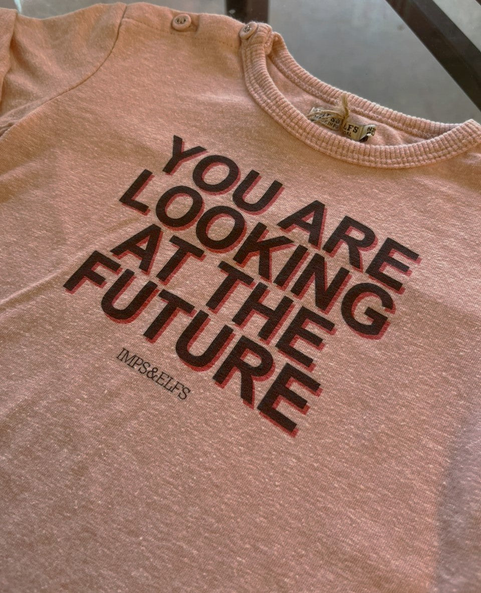 Brighten up your little one's wardrobe with this playful salmon pink t-shirt from Imps & Elfs. Made from 100% soft cotton, it features a bold front print that reads "You are looking at the future"—a fun and empowering statement for your tiny trendsetter. Designed with snap buttons at the shoulder for easy dressing, this unisex tee is perfect for babies aged 3–6 months. Comfy, cute, and full of personality!