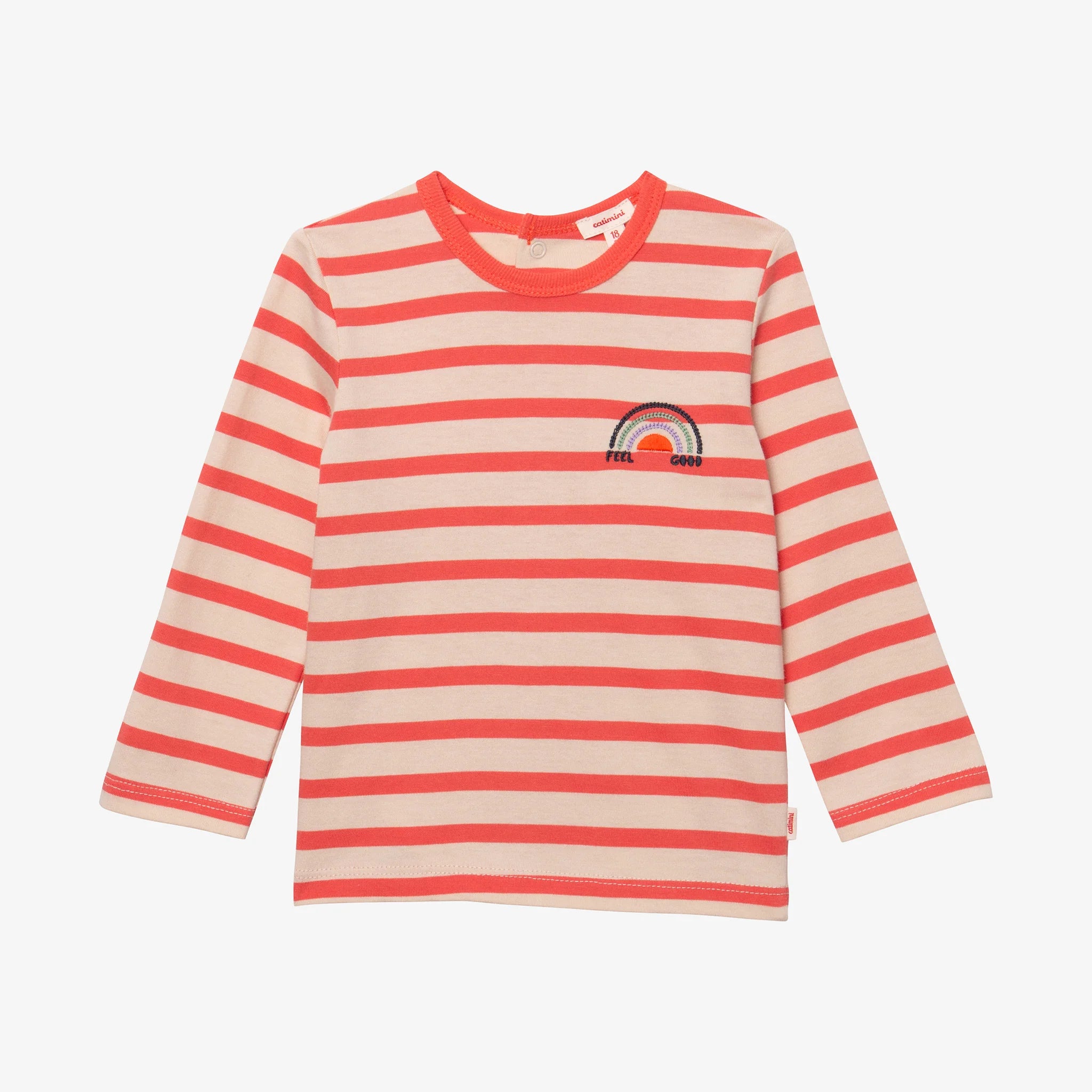 This catimini orange-striped longsleeve is an essential wardrobe piece, offering both comfort and style. Made from soft, breathable fabric, it provides a relaxed fit that ensures all-day comfort. The classic crew neckline and long sleeves make it a versatile option for layering or wearing on its own. Features an adorable emboidered rainbow with the words "feel good" lining the bottom. Whether you're dressing for a casual day out or lounging at home, this shirt pairs effortlessly with jeans, shorts, or skirts.