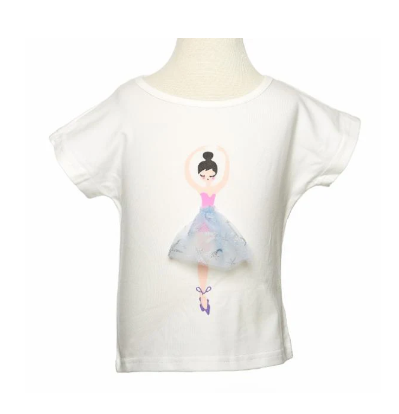 Be a trendsetter with our Ballerina tee, crafted from 95% cotton and 5% spandex for the perfect balance of comfort and stretch. This white tee features ruffled sleeves and a charming ballerina print, complete with a 3D blue tutu for an extra touch of fun. Comfortable, stylish, and easy to wear, this tee is perfect for adding a chic touch to any casual outfit. Plus, it's machine washable for easy care, combining fashion and practicality effortlessly.