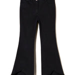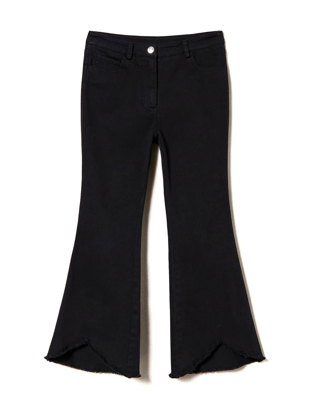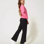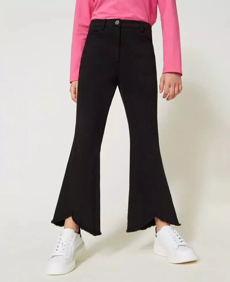 These stylish flared bull trousers from Twinset are a must-have for fashion-forward 8-year-olds. Crafted in a sleek black fabric, they feature the iconic Twinset logo in silver on the back pocket for a touch of elegance. The trousers are designed with a frayed V-shaped rip at the bottom, giving them a trendy, distressed look. Perfectly blending comfort and style, these trousers are ideal for young trendsetters looking to stand out.