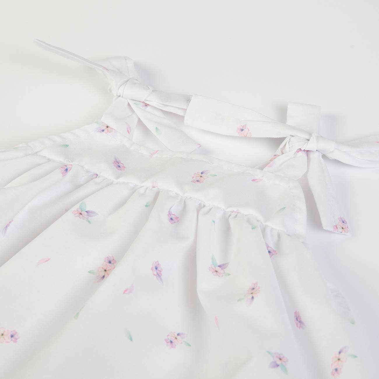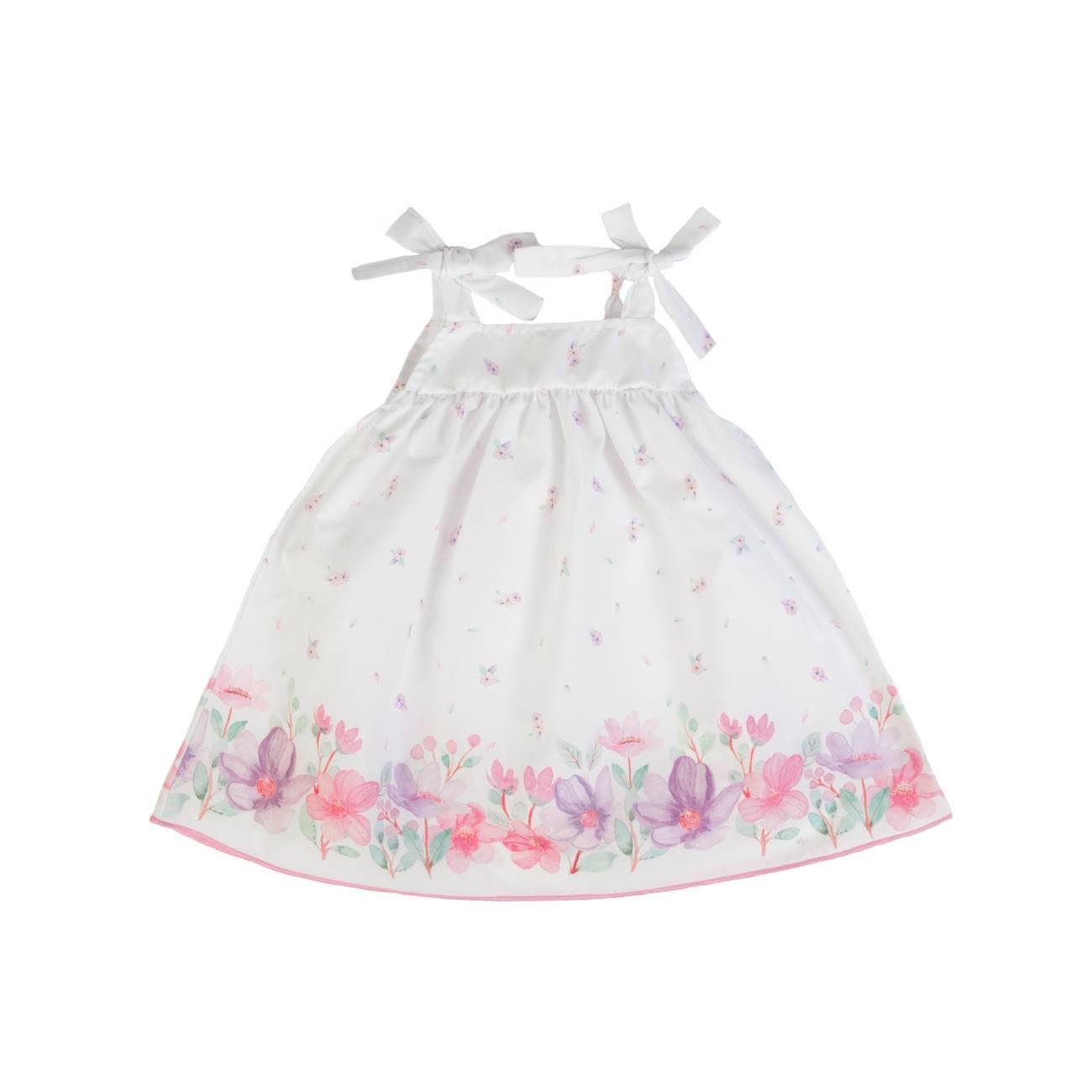 Add a touch of elegance to your little girl's wardrobe with this charming white woven dress! Featuring bow straps and a delicate purple and pink flower print, this dress is perfect for spring and summer days. The hem is adorned with a pink trim and larger purple and pink flowers, adding an extra touch of sweetness.