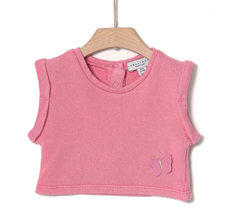 This pink sleeveless blouse with matching cotton shorts is a charming set for girls, featuring a soft pink dye color and a playful 3D butterfly detail at the bottom. The elasticized sleeves and neckline ensure a comfortable fit, while the soft, breathable organic cotton provides all-day comfort for casual looks. This blouse pairs perfectly with the coordinating shorts for a stylish, laid-back summer outfit. Plus, it's machine washable for easy care!