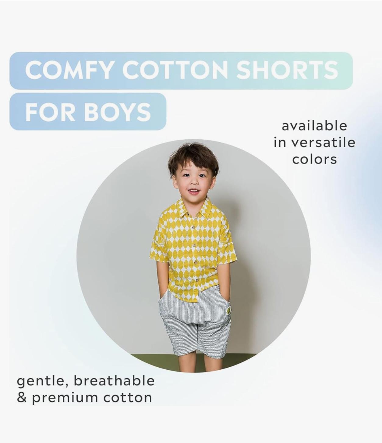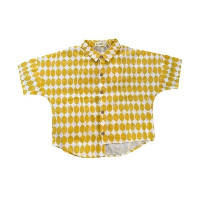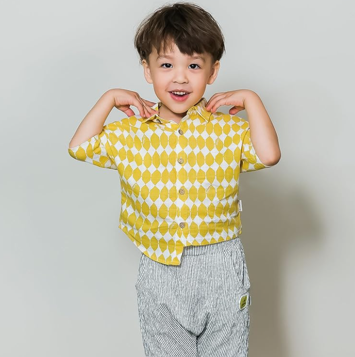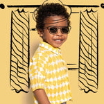 The Aimama Collared Short Sleeve Button-Down Shirt is a stylish and breathable staple for little boys aged 12 months to 6 years. Made from soft, lightweight cotton, this crisp white shirt features a unique yellow striped pentagon pattern for a fun yet classic look. The collared design and short sleeves make it perfect for warm-weather outings, while the brown buttons add a charming, rustic touch. Whether dressed up or worn casually, this versatile shirt is a must-have for any little one’s wardrobe!